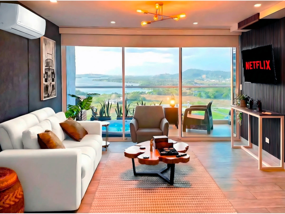 Unsere elegante Wohnung befindet sich in einem der vollständigsten und modernsten Gebäude im exklusiven Sektor „Cielo Mar“. Du bist nur wenige Meter vom „Playa Azul“, einem der besten Strände der Stadt, 10 Minuten vom historischen Zentrum und nur 5 Minuten vom Flughafen entfernt. Die Wohnung bietet einen außergewöhnlichen Blick auf die Bucht und das Meer, den du vom privaten Whirlpool auf deinem Balkon genießen kannst. Du kannst auch die unglaublichen Infinity-Pools auf dem Dach genießen, komplett mit Whirlpool, Sauna, Terrassenbar und Grill.
