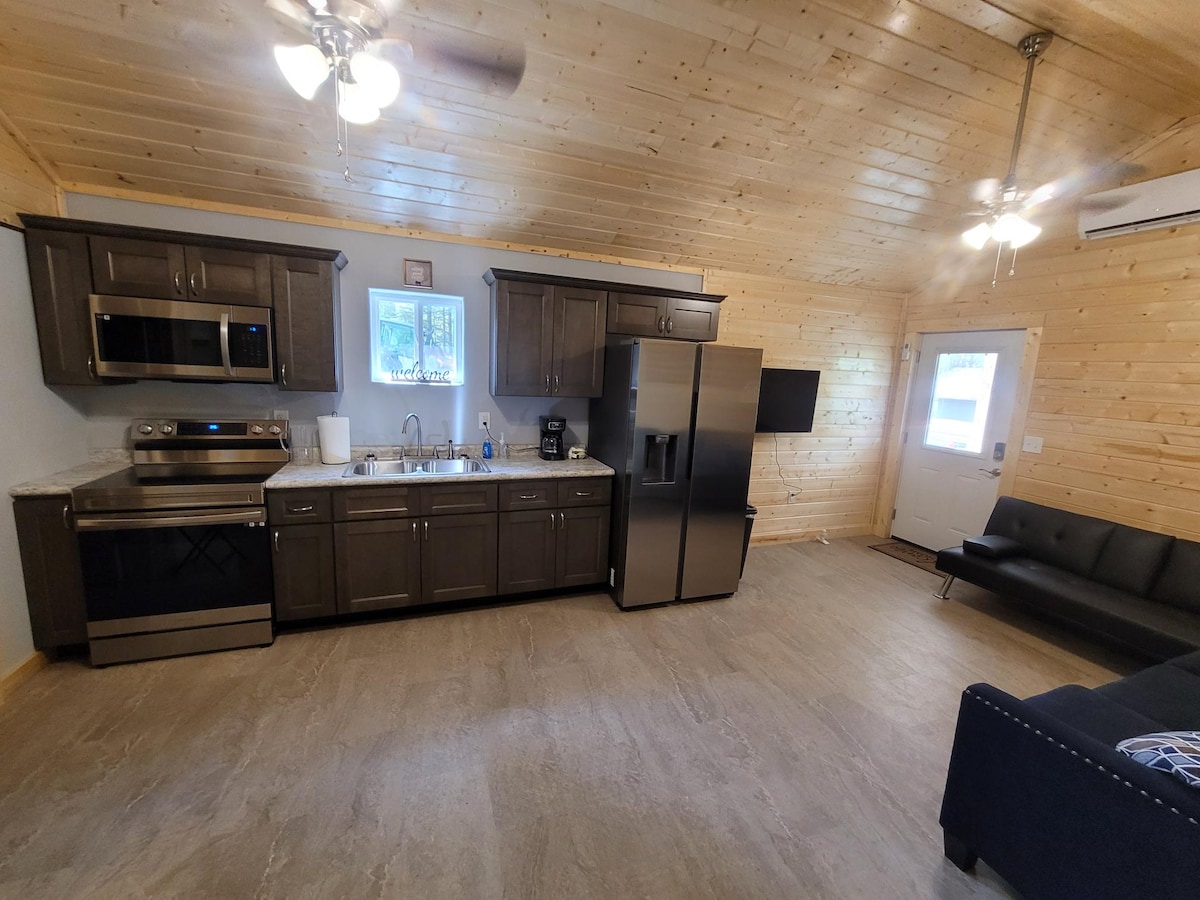Genieße eine ruhige Zuflucht. Diese neu gebaute Hütte mit allen modernen Annehmlichkeiten befindet sich im historischen Stearns, KY. Umgeben von Bäumen und mit Blick auf eine schöne Weide können Besucher sich entspannen und die Wander- und Reitwege des Big South Fork und des Daniel Boone National Forest, Kajakfahren und die malerischen Attraktionen der Cumberland Falls genießen. Genieße und sehe dir auch die malerische Eisenbahn Big South Fork an. Überwachungskameras sind ausgeschaltet, wenn Gäste die Hütte belegen.