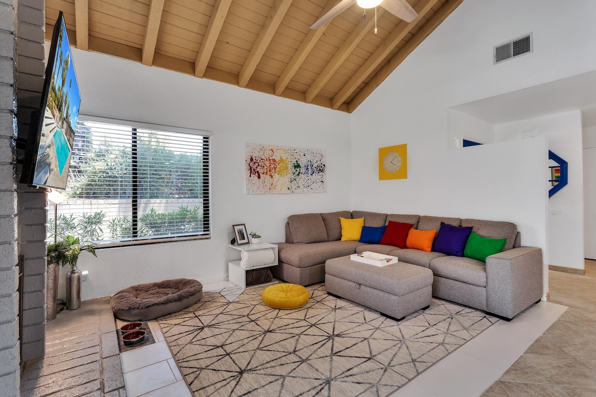 Lizenznummer 015827, max. 2 Personen, max. 1 Fahrzeug Schöne moderne 320 Quadratfuß große Casita aus der Mitte des Jahrhunderts, mit gewölbter Decke, eigenem Eingang, Parkplatz abseits der Straße, Kingsize-Bett und eigenem Bad. Bodenhohe Fenster mit Blick auf Pool, Spa, Cabana, Feuertisch und gepflegter Garten. Klimaanlage/Heizung, 42-Zoll-Flachbild-SmartTV, WLAN, hochwertige, chemisch gereinigte Bettwäsche, Ess-/Arbeitstisch, viel Stauraum für Kleidung und Gepäck. Gut ausgestattete Küchenzeile/Mini-Kühlschrank erwarten dich. Entfernung mit Uber zu den April Music Festival Shuttles.