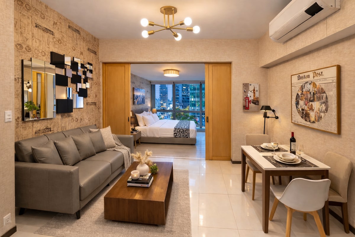 Übernachte in den One Uptown Residences in Uptown BGC, perfekt für bis zu 3 Gäste. Genießen Sie von dieser stilvollen, von New York inspirierten 36 m² großen Unterkunft mit Doppelbett, 100-Mbit/s-WLAN, Kabel-TV und Netflix einen direkten Blick auf den tanzenden Brunnen der Uptown Mall. Beinhaltet schlüssellosen Zugang und KOSTENLOSE Parkplätze. Der Zugang zum Pool ist von Dienstag bis Freitag möglich, vorbehaltlich der Hausordnung. Nur wenige Schritte von der Uptown Mall und dem Grand Hyatt BGC entfernt – eine geräumigere und preiswertere Alternative zu den nahegelegenen Luxushotels.