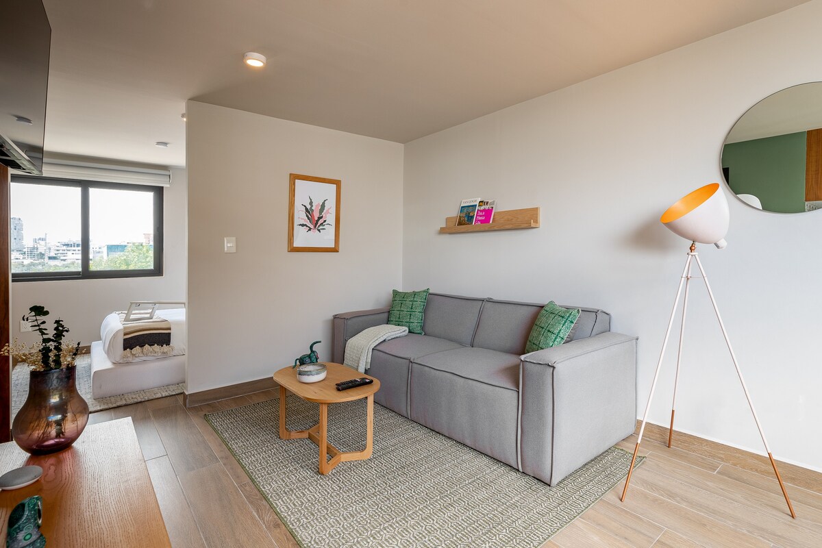 Beautiful studio for rent, inside a modern condominium that has 24/7 surveillance, gym, covered parking space (extra cost), elevators, interior garden, we have a metrobus stop a few steps away, the subway is two blocks away and a bike station one block. Precioso estudio en renta, dentro de un moderno condominio que cuenta con vigilancia 24/7, gimnasio, estacionamiento techado (pago extra), elevadores, jardín interior, a 2 cuadras del metro, metrobus a unos pasos y ecobici cruzando la calle.