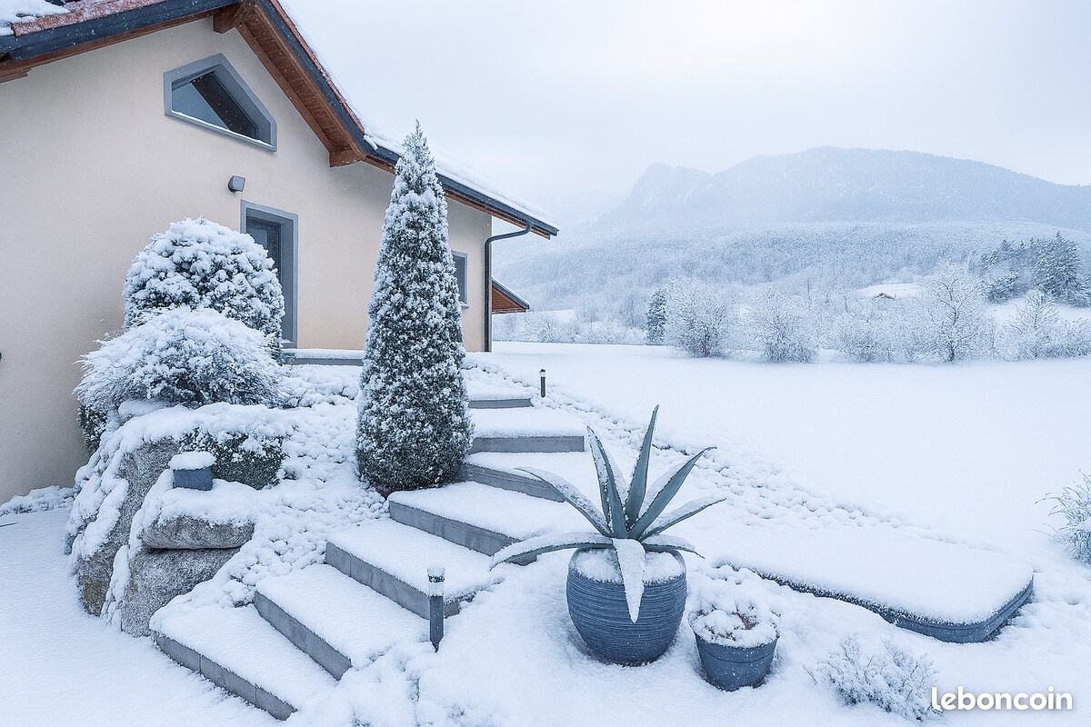 10 Minuten vom ersten Skigebiet Le Mont-Saxonnex entfernt. 45 Minuten von Genf, Annecy und Chamonix entfernt. Genieße den Komfort einer modernen schlüsselfertigen Villa: - voll ausgestattete Küche (Fondue und Raclette Set) - 2 Badezimmer (Regendusche und Badewanne), Handtücher, Duschgel und Shampoo werden bereitgestellt - 2 Throne - 3 Schlafzimmer, Queensize-Betten bereits drapiert - TV-Lounge, Prime Video, Bluetooth-Lautsprecher, WLAN inbegriffen - Garage + Parkplatz vor der Villa