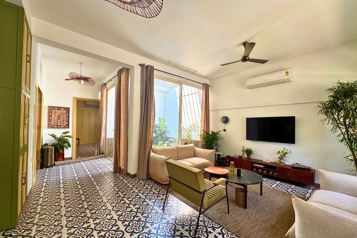 Dieses geräumige und private Penthouse mit 2 Schlafzimmern und 2 Badezimmern, eingebettet in die ruhigen Gassen von Vagator, ist von Bäumen bedeckt und sorgfältig gestaltet, um einen Kokon des Komforts für unsere Gäste zu schaffen. Ausgestattet mit Oberlichtern, lässt es dich den sonnigen und mit Sternen erleuchteten Himmel von Goa aus dem Komfort deiner luxuriösen und modernen klimatisierten Innenräume genießen. Auf der privaten Terrasse kannst du dich in der frischen Meeresbrise vom nahe gelegenen Vagator-Strand aus entspannen, während du die spektakulären Farben des Sonnenuntergangshimmels von Goa in der Dämmerung aufnimmst.