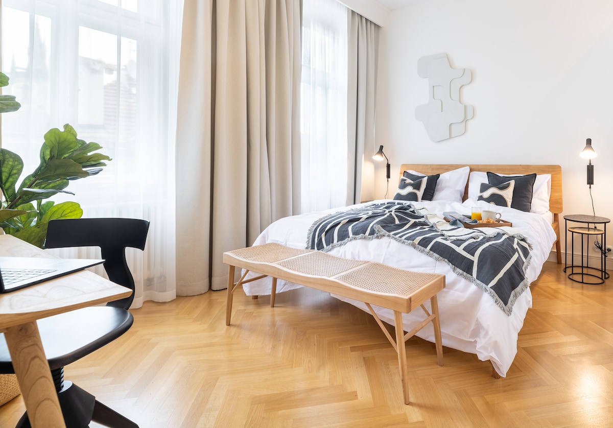 Frühstücke an einem designbewussten Tisch in einer hellen Küche mit knorrigen Holzböden und minimalistischen Verzierungen. Der Raum mit 95 m², hohen Fenstern überschwemmt einen lebendigen Wohnbereich mit natürlichem Licht, wo ein modernes Sofa den perfekten Ort bietet, um es sich mit einem guten Buch bequem zu machen. Darüber hinaus kannst du nachts jeden Schluck deines Schlafes genießen, da der Ort trotz seiner sehr zentralen Lage sehr ruhig ist. Ich hoffe, dass du mein Zuhause so lieben wirst wie ich und dass es deinen Aufenthalt zu einem reizvollen Erlebnis machen wird.