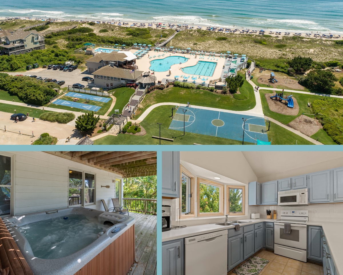 Willkommen in Coral Cove in Corolla! Entspann dich in dieser fast neuen, gut ausgestatteten Wohnung und entspanne dich unter den Sternen in deinem eigenen privaten Whirlpool! - 2 Betten, 2 Bäder, 6 Schlafplätze, 2 Kingsize-Betten + Queensize-Schlafsofa - 8–10 Minuten zu Fuß zum Strand. - Hunde erlaubt! (gegen Gebühr) - Strandausrüstung inklusive Wagen. - Bettwäsche und Strandtücher inklusive! - Eine Ebene ohne Stufen zum Betreten oder Verlassen. - Privater Whirlpool - Privater Hinterhof mit Sitzgelegenheiten