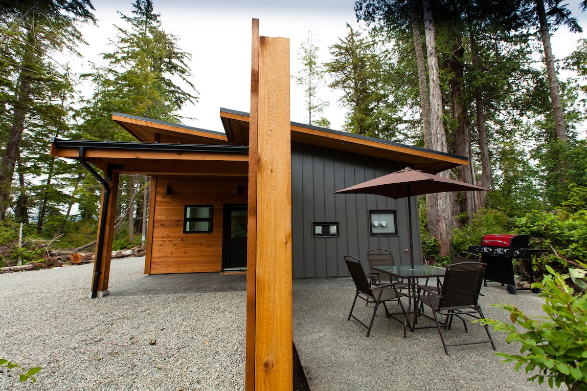 Schöne neue moderne Luxus-Einzimmerhütte mit Blick auf den Regenwald in Jensen Bay. Lehne dich zurück und entspanne dich in dieser maßgeschneiderten Hütte in einer fantastischen Gegend. Diese Hütte ist nur wenige Gehminuten von den Stränden Cox Bay und Chestermans und eine kurze Fahrt in die Stadt entfernt. Strandcafés und Restaurants. Dieser Raum ist ideal für ein Paar oder eine kleine Familie, die eine Ausgangsbasis sucht, um Tofino zu erkunden. Wir sind eine lizenzierte, registrierte Vermietung, in voller Übereinstimmung mit den Bezirks- und neuen Provinz-STR-Gesetzen