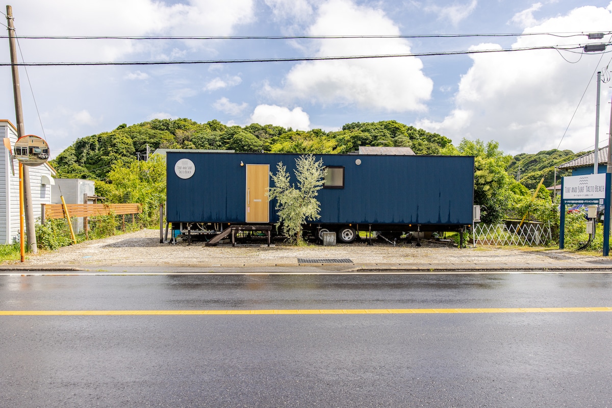 Dies ist eine Mietvilla und Glamping-Anlage 3 Minuten zu Fuß vom Strand von Taitokai entfernt.Es gibt zwei Zimmer auf der gesamten Unterkunft, und eine Gruppe von mehreren Familien kann mit Privatsphäre übernachten.Es gibt eine heiße Dusche im großen Rasengarten, sodass du nach dem Spielen im Meer bequem bleiben kannst, es gibt auch einen permanenten Tisch und Stühle im Freien, und es gibt auch eine Grillausrüstung, Feuerstelle und kann von Regen gemietet werden, sodass du die Natur leicht genießen kannst. Wir vermieten einen kleinen Klapppool, den Kinder kostenlos genießen können.Es gibt auch einen Surfbrettaufbewahrungs- und Trocknungsraum, der nicht auf den Regen trifft. In der Nachbarschaft gibt es nicht nur den Taito Beach, der zum Schwimmen und Surfen mit sanften Wellen geeignet ist, sondern auch die Tsurigasaki-Küste, den olympischen Surfort sowie Angelplätze und Wanderwege, die zur Aussichtsplattform führen, damit du die Natur unabhängig von der Jahreszeit genießen kannst.Es gibt auch stilvolle Cafés, Restaurants und Bars in der Nachbarschaft, sodass du das „Essen“ genießen kannst.Es gibt auch einen Supermarkt innerhalb von 4 Gehminuten. Die Kapazität des Wohnwagenhauses beträgt 9 Personen.Bitte erkundige dich nach der Nutzung der Anlage für mehr als 9 Personen (z. B. im Auto im Hinterhof oder mit dem Grill).