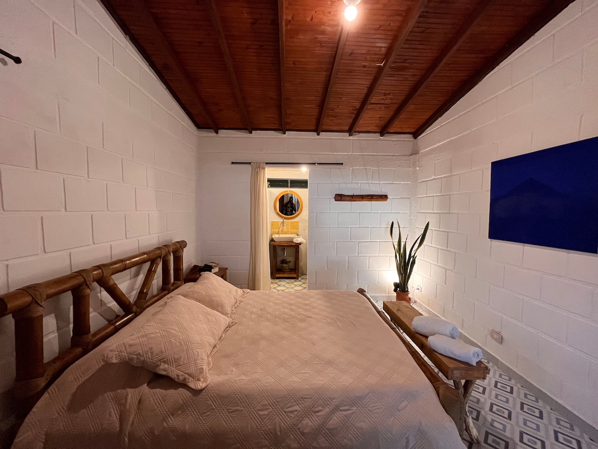 Entspanne, erhole dich oder arbeite von zu Hause aus in unserer ruhigen WLAN-fähigen Hütte mit DirecTV und eigenem Bad mit beheizter Badewanne und Dusche. Die Hütte verfügt über ein Doppelbett und ein Sofa, das sich in zwei schmale Einzelbetten umwandelt, einen privaten Garten, eine Küche, einen Grill und eine eigene Veranda mit herrlichem Blick auf das Cauca-Tal. In der Nähe der historischen Stadt Marsella. Entspanne dich in der kühlen, ruhigen Atmosphäre deines eigenen schönen Gartens voller Blumen und Vögel. Basierend auf einem kleinen familiengeführten Kaffeebauernhof.