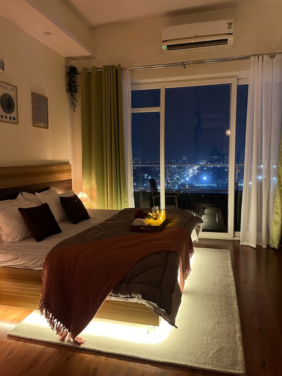 ✨ Luxus-Studio mit Blick auf die Skyline | Hohe Etage | Balkon | Prime Noida Wache in dieser eleganten Studio-Wohnung auf der oberen Etage über der Stadt auf, die sorgfältig für Gäste gestaltet wurde, die Komfort, Privatsphäre und ein erstklassiges Aufenthaltserlebnis zu schätzen wissen. Diese Unterkunft befindet sich in einem der begehrtesten Türme von Noida und bietet eine schöne offene Aussicht, einen eigenen Balkon und Innenräume in Hotelqualität – perfekt für Geschäftsreisende, Paare und lange oder kurze Aufenthalte.