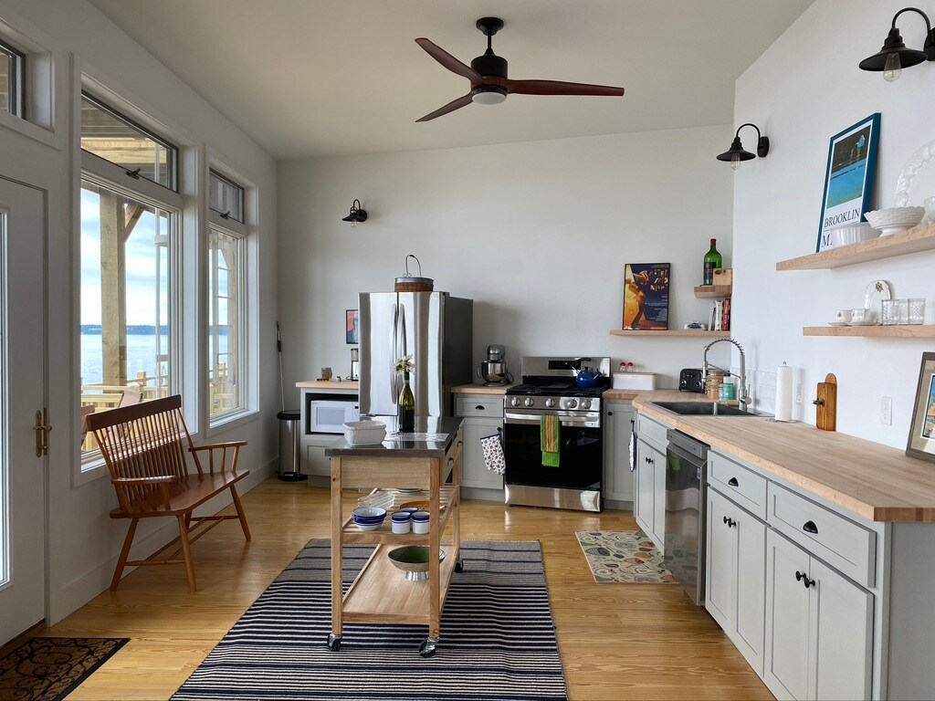 Moderne Studiowohnung in einem historischen Gebäude in Eastport Maine. 460 Quadratfuß mit privater Terrasse, Kingsize-Bett, Sitzecke mit Gasherd, Küchenzeile und Badezimmer. Die begehbare Terrasse im zweiten Stock bietet einen Blick auf den großen Seitenhof und verfügt über einen Tisch, einen Sonnenschirm und Stühle für Mahlzeiten im Freien oder um einfach den Tag zu genießen. Privater Eingang und Parkplätze abseits der Straße. Gut ausgestattete Küche mit Kühlschrank/Gefrierschrank, Keurig, Wasserkocher, Toaster, Kochgeschirr, Messern, Utensilien, Geschirr. Großer Kleiderschrank mit Staubsauger und Heizung.