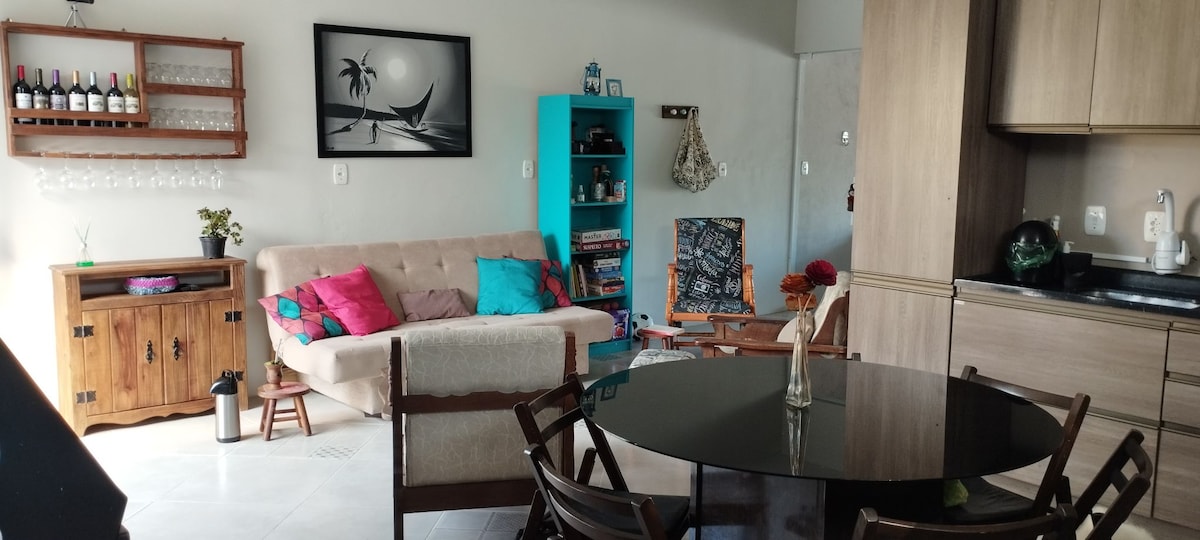 Sobrado próximo à praia (300m), com infraestrutura aconchegante para curtir tbm dias de inverno, em frente a lareira. O espaço foi pensado para descanso ou trabalho, sendo a parte superior bastante silenciosa, iluminada e vista para o mar. Alpendre amplo, com espaço para jogos (disponível mesa de ping pong), redes, cadeiras de descanso, churrasqueira e parrilla. Possui brinquedos e jogos infantis para que os dias sejam ainda mais prazerosos. Aceita Pets. Acomoda com privacidade e integração.