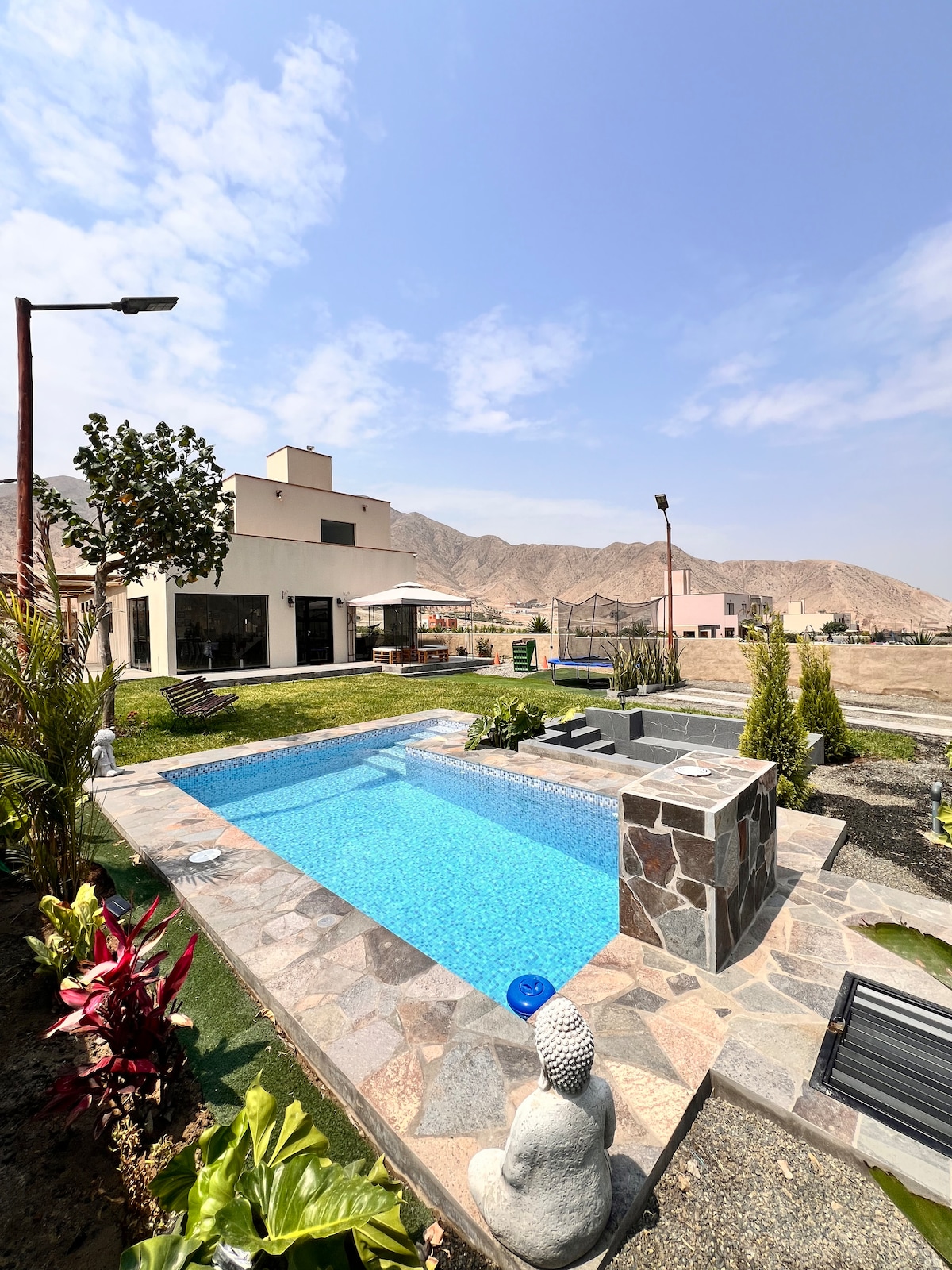 Entfliehe der Stadt und genieße eine einzigartige Erfahrung in unserem gemütlichen Landhaus. Genieße das beste Klima in der Nähe von Lima, mit Sonne das ganze Jahr über. Pool, großer Garten, Grillplatz und Lehmofen. Das Hotel liegt in einer Eigentumswohnungsanlage mit nur 5 unabhängigen Häusern. Gemütliche und belüftete Räume. Voll ausgestattete Küche. Fernseher und Highspeed-WLAN. Privatparkplatz. Haustierfreundlich. Perfekt für Familien, Paare oder kleine Gruppen, die Ruhe und Frieden suchen. Entspanne dich auf dem Land!