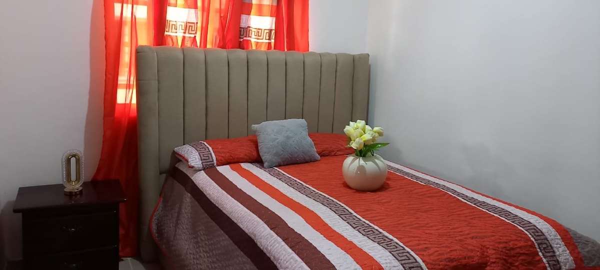 Gemütliche Wohnung mit zwei Schlafzimmern, eine, die mit Klimaanlage und TV ausgestattet ist, verfügt über heißes Wasser und die Annehmlichkeiten, um ruhig zu schlafen und deine Besorgungen zu erledigen. Besuche attraktive Orte ganz in der Nähe des Hauses, 10 Minuten vom Flughafen entfernt, 10 Minuten vom Flughafen entfernt, 15 Minuten vom Flughafen entfernt, ein Supermarkt innerhalb des Wohnkomplexes, eine bewachte Gegend, eine Fläche von 100 Metern mit Eisdiele, Sandwich, die Wohnung ist sehr sicher und hat einen kontrollierten Zugang.
