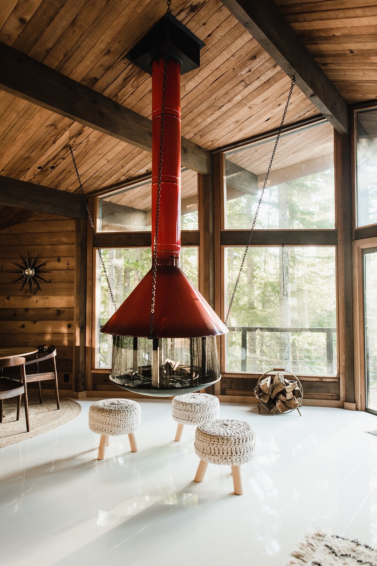 Übernachte in einer einzigartigen, modernen Baumhütte aus der Mitte des Jahrhunderts, hoch oben in den Bäumen. Jeder in der Gegend kennt das Haus auf Stelzen. Zu den Highlights gehören ein hängender Vintage-Kamin, eine malerische umlaufende Terrasse, ein Whirlpool und ein moderner Hüttenstil. Gelegen auf einem ruhigen, bewaldeten Grundstück in der Nähe des Cle Elum Lake. Genieße ein Winterwunderland von Dezember bis März und ein Paradies für Naturliebhaber im Sommer. 10 Minuten zur Innenstadt von Roslyn. 40 Minuten zum Skigebiet Snoqualmie Pass. 1 Stunde nach Leavenworth. 1,5 Stunden nach Seattle und zum Flughafen SeaTac.
