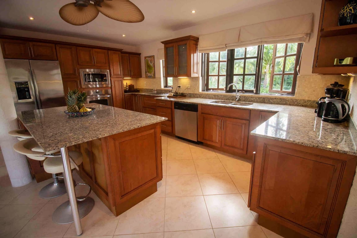 Fabelhaftes, modernes Haus mit 3 Betten und 3 Bädern, großem Garten und bestem Blick auf die Karibik. Genieße Sonnenuntergang auf der Terrasse mit endlosem Blick auf die Karibik. Dieses Haus im Innen-/Außenbereich wurde gebaut, um die Kühlbrise zu fangen. Kürzlich aktualisiert, alle Schlafzimmer verfügen über Klimaanlage. Die gewölbte Küche öffnet sich zum Essbereich im Freien und verfügt über hochwertige Geräte und Kochgeschirr. Das Hotel liegt an einer ruhigen Lage, nur wenige Minuten vom Fish Pot entfernt. Ideal für Familien.