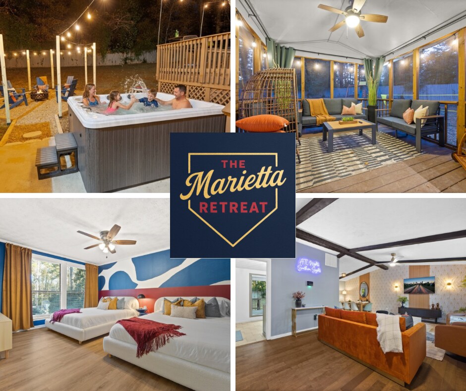 Wache in einer Kingsize-Suite mit Badewanne auf, verbringe sonnige Nachmittage am SAISONAL beheizten Pool und beende den Abend im sprudelnden Whirlpool. Diese offene, geräumige Villa mit 4 Schlafzimmern in der Nähe des Truist Parks verbindet Luxus mit der Privatsphäre von zu Hause. ★ Wohnzimmer mit 65-Zoll-Smart-TV ★ Küche des Kochs, Oberlichter ★ Zwei Suiten mit Kingsize-Betten und Spa-Bädern sowie Zimmer mit Queensize-Betten und Etagenbetten ★ WLAN, Arbeitsbereich und Wäscherei ★ Zwei Terrassen, Essbereich im Freien und Feuerstelle ★ Pool- und Tischtennisplatten ★ Kostenloser Parkplatz für 5 Autos ★ Nur 15 Minuten bis The Battery Atlanta.