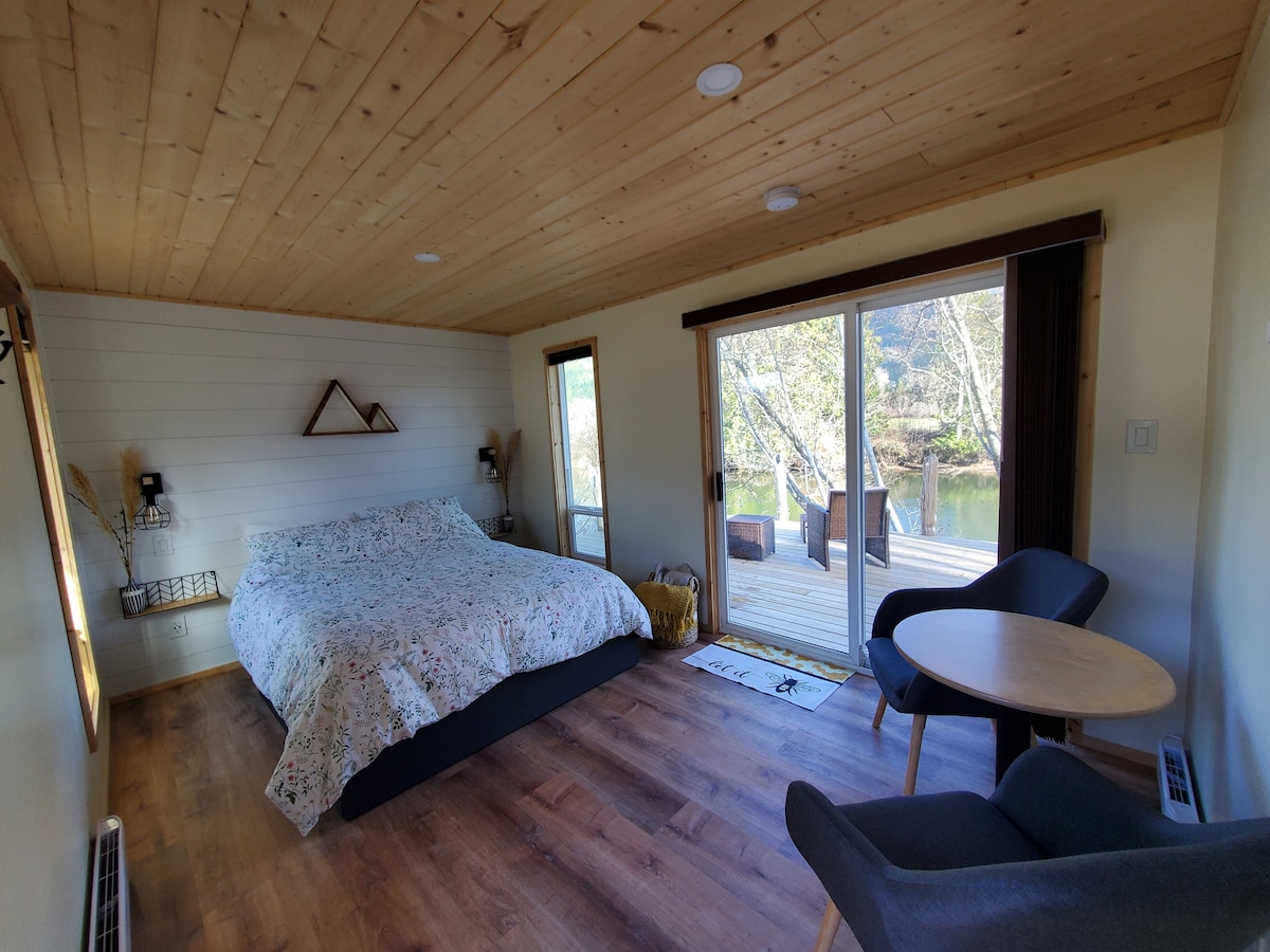 Vergiss deine Sorgen in dieser geräumigen, umweltfreundlichen, privaten Suite. Voll ausgestattete Küche mit Kochutensilien, Espresso-/Kaffeebar, Medienraum/Büro mit Platz für Yoga. Große Terrassentüren in der Hauptsuite bieten eine malerische Aussicht auf den Wald und den Bach. Jede Liebe zum Detail wurde sorgfältig vorbereitet, von seidig glatter Bettwäsche, Bademänteln für den Whirlpool, Bio-Kaffee und ein paar leckeren Leckereien, die speziell für deine Ankunft zubereitet wurden.
