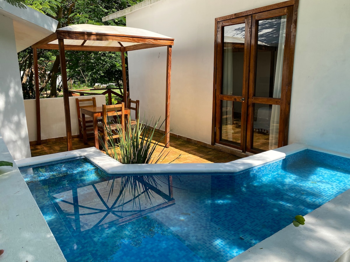 Eingebettet in die ruhige Nordseite der Stadt bietet diese gemütliche Wohnung einen privaten Rückzugsort, umgeben von üppigen Palmen und den beruhigenden Geräuschen tropischer Vögel. Mit unabhängigem Zugang genießt du während deines Aufenthalts Privatsphäre und Komfort. Das geräumige Kingsize-Bett und die Klimaanlage versprechen erholsamen Schlaf. Nur 15 Gehminuten vom Platz und eine Minute zu Fuß vom Strand entfernt. Ideal für diejenigen, die eine ruhige Flucht im Herzen der Natur suchen, mit der Schönheit des Dschungels direkt vor deiner Tür.