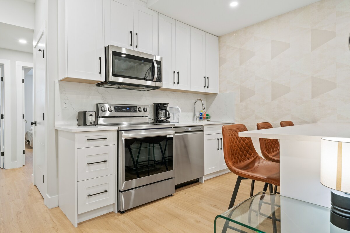 Willkommen in deinem zweiten Zuhause! 🏡 Diese helle und gemütliche Souterrain-Suite mit 2 Schlafzimmern verfügt über große Fenster, durch die viel Tageslicht hereinfällt 🌞 🛋️ Was dir gefallen wird: • Bequeme Betten für einen erholsamen Aufenthalt 💤 • Stilvolle Wet-Bar für ein paar Drinks 🍷 • 55-Zoll-Fernseher mit Netflix-Abonnement 🎬 • Bestes 🥇 Glasfaser-WLAN mit 2 Gigabit ⚡️ • Reservierter Parkplatz direkt am Eingang 🚪 📍 Erstklassige Lage: Eingebettet in ein ruhiges Viertel in der Innenstadt 🌳 • 🚗 15 Minuten zum Flughafen YYC • 🏙️ 12 Minuten bis zur Innenstadt • 🚌 2 Minuten zur Bushaltestelle