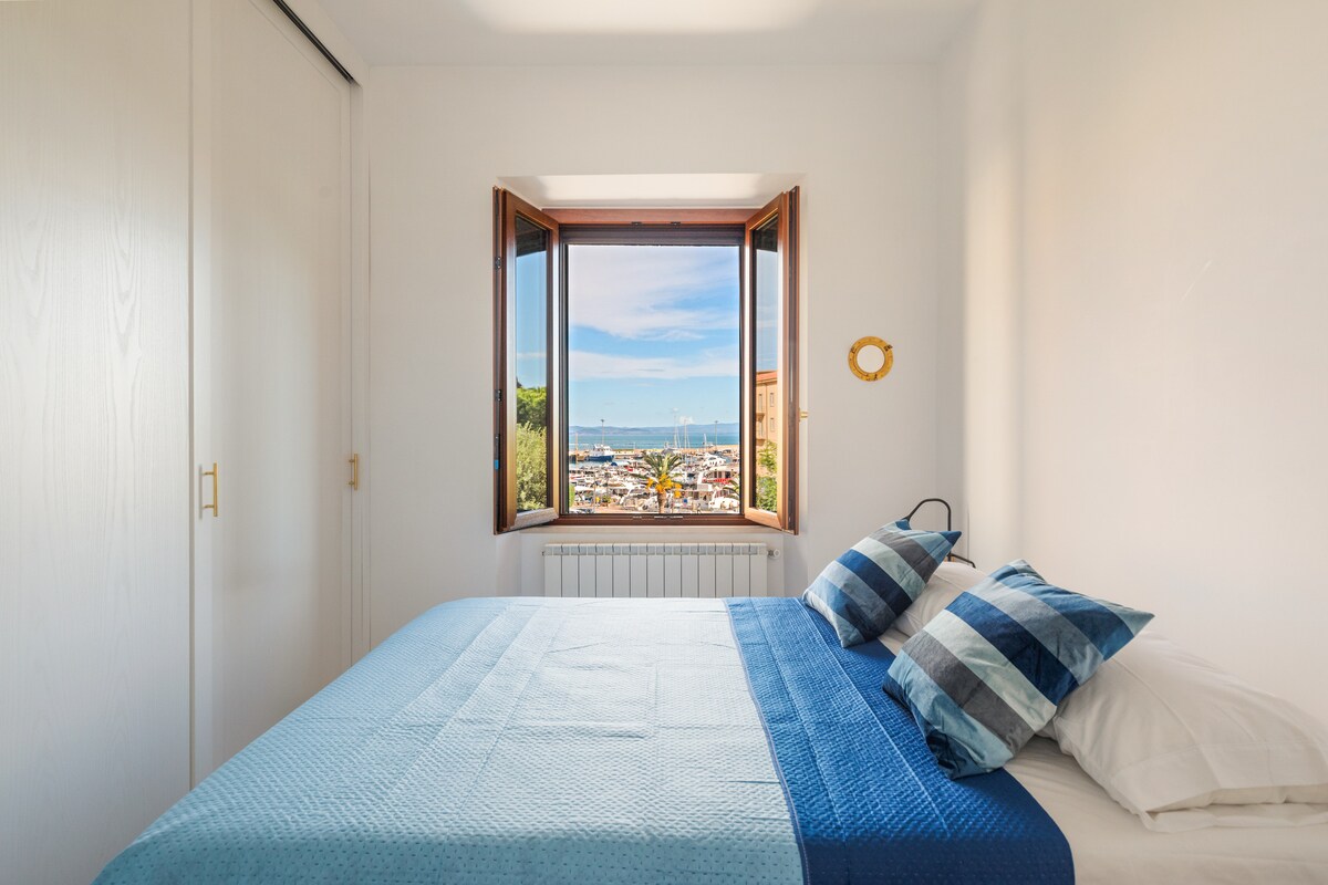 Mit einer der außergewöhnlichsten Ausblicke in der Toskana, die du sogar von deinem Schlafzimmer aus genießen kannst - du wirst nicht mehr gehen wollen! Ruhig gelegen in der meistfotografierten Straße der Stadt, aber nur 3 Gehminuten von Restaurants im schönen Hafen und 10 Gehminuten von den Badestellen entfernt, ist die Far Horizons Wohnung eine kürzlich renovierte, farbenfrohe und komfortable Wohnung mit atemberaubendem Meerblick von jedem Fenster und über den alten Hafen, Orangengärten und dem Spanischen Fort aus dem 15. Jahrhundert.