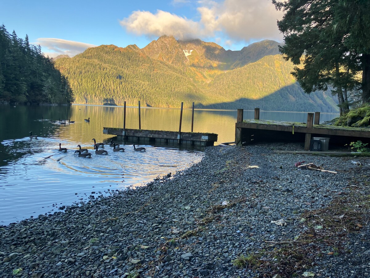 This studio cabin has a queen size bed, futon sofa, bathroom w/ shower, kitchenette, BBQ, chest freezer, wifi. There is parking right next to the cabin. You are a stones throw away from a beautiful lawn with lawn chairs and fire pit and right next to the beautiful green Eyak River. We're nestled at the edge of the Chugach National Forest and the Prince William Sound in Cordova, Alaska. We are located 6.5 miles away from the city of Cordova.