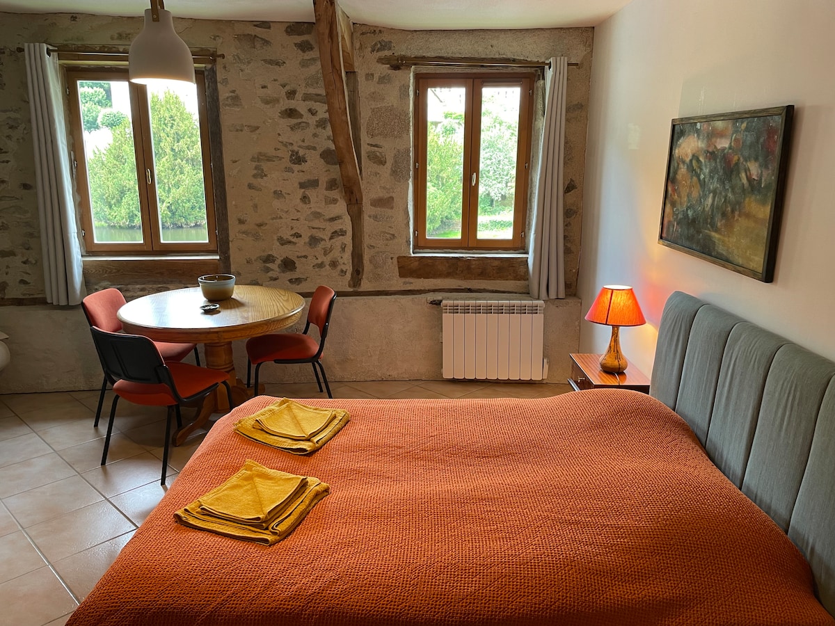 Unsere 1-Zimmer-Wohnung verfügt über 2 Doppelbetten, Schlafsofa mit einer kleinen Doppelbettmatratze. Du kannst das Schlafzimmer mit einem großen Vorhang halbieren. Es gibt ein Badezimmer mit Badewanne, ein Waschbecken und ein WC mit Waschbecken. Küche ausgestattet mit Kochgeschirr, Tellern, Besteck, Wasserkocher, Kaffeemaschine, Kaffee, Tee, Tee, Salz, Salz, Pfeffer und Speiseöl. Lass dir den Garten nicht entgehen! Spaziere durch den großen Moulin, spaziere auf dem grünen Weg und entdecke eine Oase der Ruhe direkt neben dem Fluss mit Tisch, Stühlen und Hängematten!