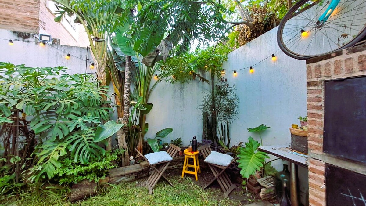Alójate en una casa llena de arte y creatividad. El Atelier de arte (que puedes usar libremente) está en planta baja y funciona como espacio creativo y multiusos, Toda la casa y hasta la propia cuadra está intervenida con murales y obra original. IG: talleralmaturquesa La propiedad cuenta con un pequeño jardín con parrilla, hamaca paraguaya y cocina totalmente equipada. Estamos en pleno centro, a 5 cuadras de la peatonal y la plaza central. La zona es tranquila, segura y de fácil acceso.
