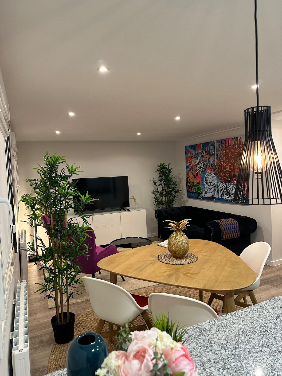 Du findest 2 Jahre alte Häuser auf einem Grundstück mit Garten und Pool, ein gemeinsames Wohnzimmer mit Kamin, ein Esszimmer zum Frühstück, eine Waschmaschine und einen Trockner für die Nutzung der Gäste, einen Spielbereich mit kleinem Fußballplatz, ein Trampolin mit einem Durchmesser von 4 m, ein Voley-Netz... Jedes Haus verfügt über mehrere einzelne Wohnungen im Inneren. Sie befindet sich im Erdgeschoss und ist für Personen mit eingeschränkter Mobilität zugänglich. Es verfügt über ein 160 x 200 Doppelzimmer, ein Badezimmer, eine Küche und ein Wohnzimmer mit einem Schlafsofa für 2 Personen.