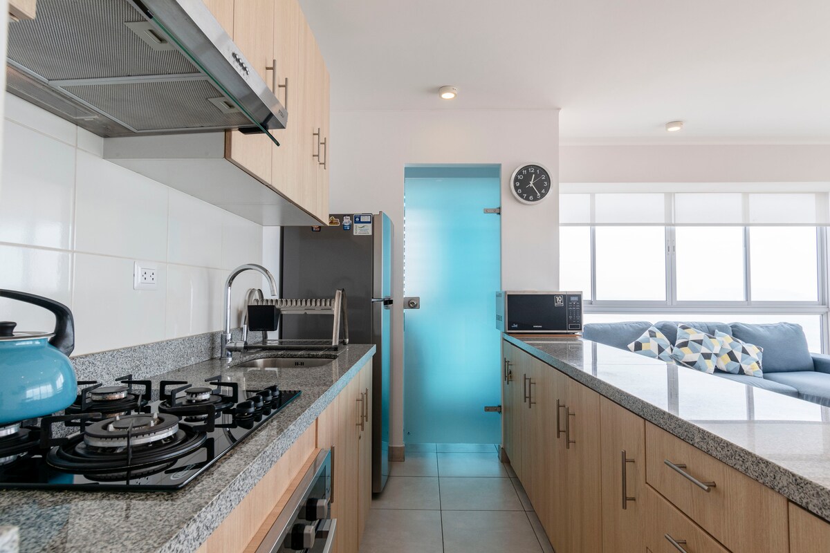 Die Wohnung befindet sich in der Nähe des Flughafens und 15 Minuten von Miraflores entfernt, entlang der Strandpromenade. Sie können von allen Zimmern aus einen Meerblick genießen. Wir bieten einen Shuttleservice und 24/7-Gästebetreuung. Die Wohnung ist komplett ausgestattet, Warmwasser mit hoher Geschwindigkeit, WLAN, 2 55-Zoll-Fernseher und verfügt über einen Panoramapool auf der obersten Etage sowie eine Sauna und einen Fitnessraum.