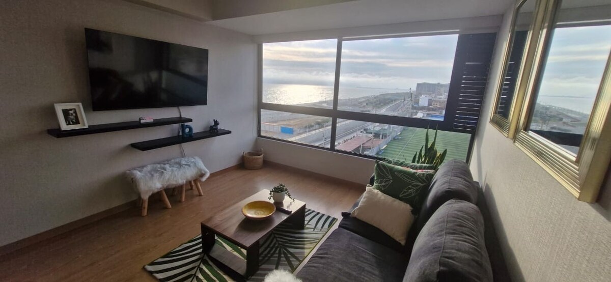 🔝Schöne Wohnung mit Blick auf das Meer 🌊und die Insel San Lorenzo 🏝. Wir haben einen Swimmingpool, eine Sauna, einen Fitnessraum und Kinderspiele. Wir haben auch 24x7 Sicherheit! Das findest du: - RIESIGER 96-Zoll-Fernseher im 🎬Wohnzimmer - 🏊♀️Pool - 🚘Privatparkplatz - ✈️15 Minuten vom Flughafen entfernt - ⭐️15 Minuten von Miraflores entfernt - 🛍5 Minuten zur Plaza San Miguel Mall - 🏟Gegenüber Arena 1 San Miguel - 🪂Gleitschirmfliegen am Strand - 🍖Grillplatz, frage - Sauna, frage
