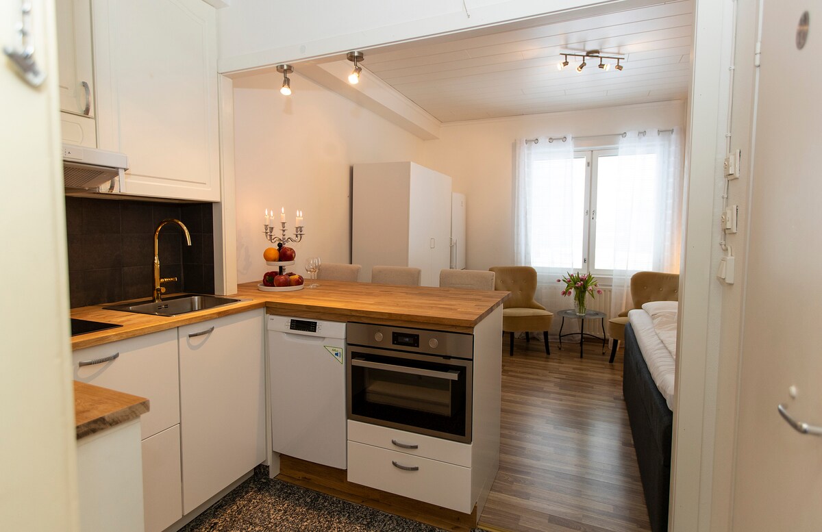 Willkommen in unserer Wohnung mit einem Schlafzimmer im Zentrum von Mariehamn, nur 5 Gehminuten vom Stadtzentrum und dem Fußballstadion WHA entfernt. Die Wohnung ist 30 m2 groß, befindet sich im ersten Stock des Gebäudes und verfügt über einen kostenlosen Parkplatz im Innenhof, einen kleinen Balkon im Westen, WLAN, einen 49-Zoll-Samsung-Smart-QLED-TV, eine Klimaanlage, eine Waschmaschine (4 kg) und eine voll ausgestattete Küche. Wir hoffen, dass du bald dabei sein kannst und deinen Aufenthalt genießen kannst!