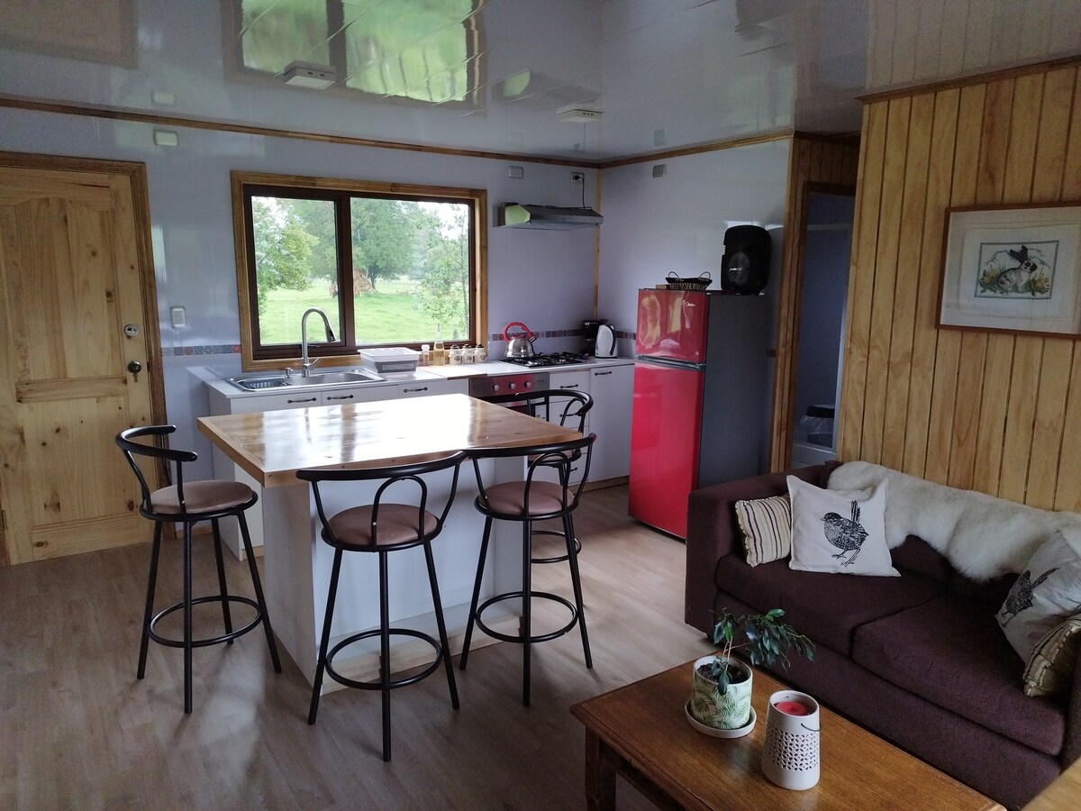 Hütten im Tiny-House-Stil, rustikal, komfortabel mit allem, was man für eine gute Erholung und Entspannung braucht, sauber, gute Heizung, Kabel-TV, auf dem Grundstück Vientos de la Laguna gelegen, ruhig, neben der südlichen Autobahn, mit einem schönen Blick auf die Lagune La Esponja und Cerró del Colmillo, Ausfahrt nach Norden zur Villa Mañihuales.