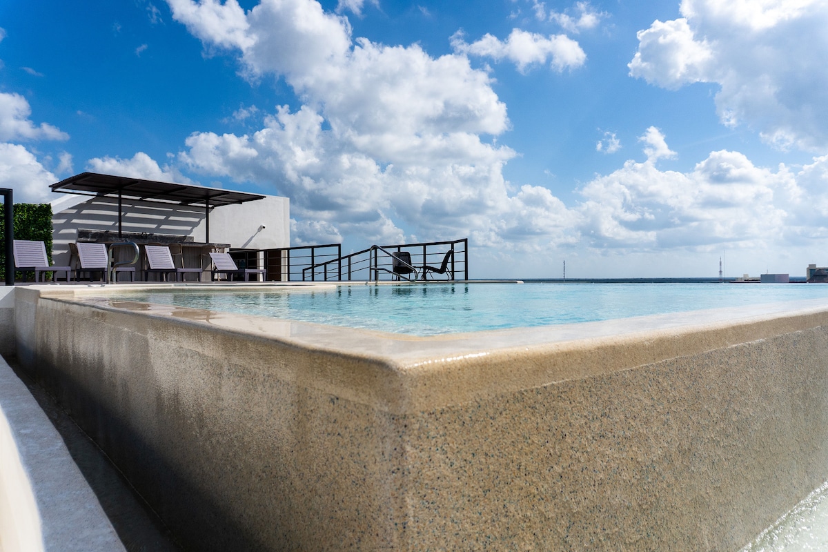Genieße diese ruhige und elegante Unterkunft mit zwei Swimmingpools, einem Kinderbereich, einem Spielzimmer, einem Fitnessraum, einem Grill und einem Parkplatz. Haustierfreundlich, perfekt für einen Familienurlaub. Entspanne dich auf dem Dach mit einem Infinity-Pool und einem Whirlpool mit heißem Wasser, während du die besten Sonnenuntergänge beobachtest. Ein idealer Ort, um sich auszuruhen, zu teilen und unvergessliche Erinnerungen mit allen Annehmlichkeiten zu schaffen, die du brauchst.