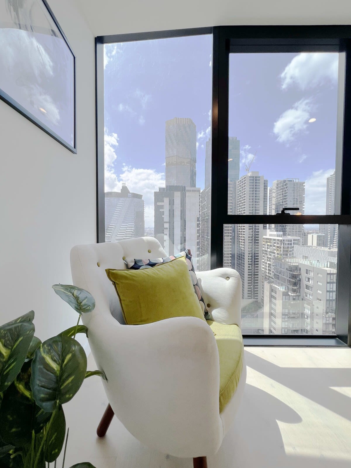 🌟 „Eines der saubersten Airbnbs, die ich je erlebt habe, makellos und gut gepflegt.“ Entspanne dich auf einer bequemen Couch und genieße den majestätischen Blick auf die Skyline von Melbourne durch raumhohe Eckfenster. Die Unterkunft ist in neutralen Tönen eingerichtet und entlehnt Elemente des skandinavischen und japanischen Designs. Genieße einen Morgenkaffee auf einem geheimen Balkon vor einem Schlafzimmer.