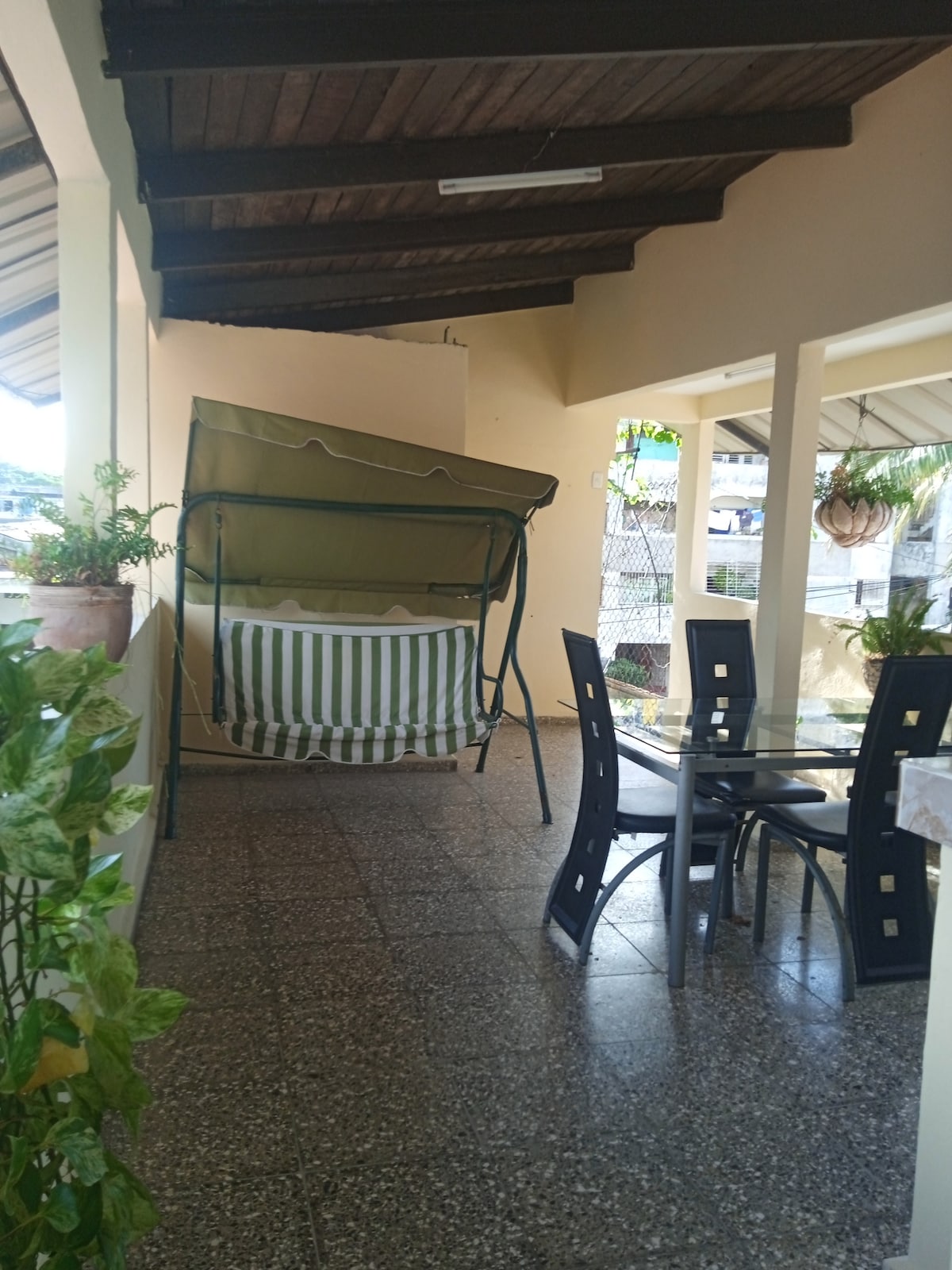 Espacio totalmente para los huéspedes, en planta alta, con dos habitaciones amplias claras y ventiladas, con una terraza común, donde ofertamos los desayunos(5 euros por persona) y ricos cocteles, con entrada independiente desde la calle Frank País. La primera habitación tiene dos camas matrimoniales y la segunda habitación tiene una cama matrimonial y2 personales,cada una con su baño privado. Es perfecta para familias, parejas o grupo de amigos.