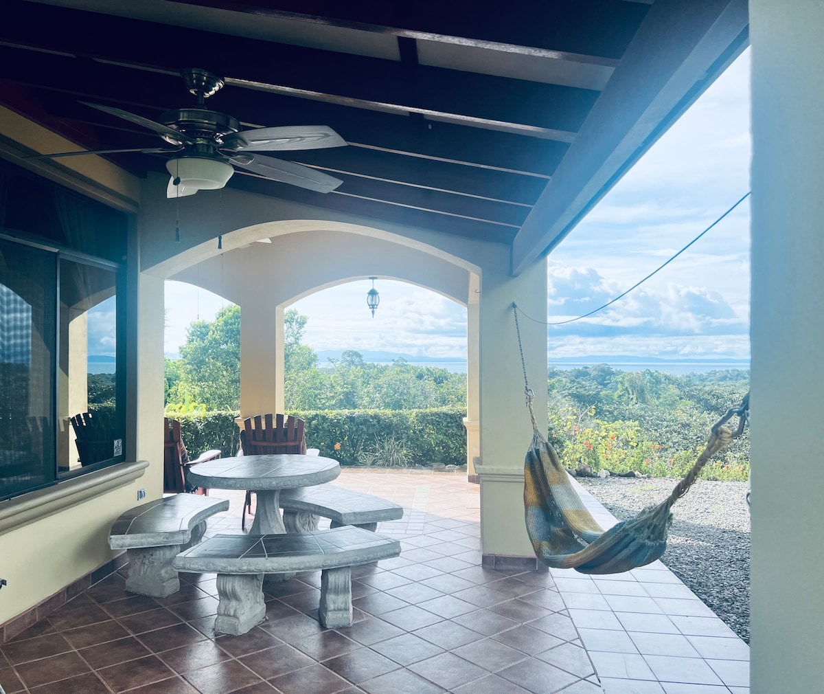 Entfliehe in eine Hacienda im spanischen Stil in Pavones mit einem bemerkenswerten Blick auf den Golfo Dulce. Dieser private Rückzugsort mit 2 Schlafzimmern und 2 Bädern bietet bequem Platz für 4 Gäste. Genieße die tägliche Brise auf der weitläufigen überdachten Terrasse, eine voll ausgestattete Küche und Klimaanlage. Nur 10 Minuten vom Salea Surf Break entfernt, ist es die perfekte Mischung aus Dschungelruhe und Strandzugang. Mit High-Speed-Internet für einen Kurzurlaub mit Internetzugang.