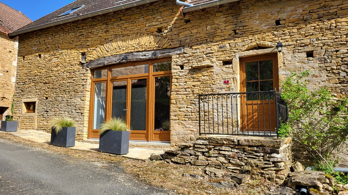 Gîte La Cersotine : maison en pierre indépendante, sur terrain clos , arboré. Maison Bourguignonne en pierre, entièrement rénovée ; le charme de la pierre et du bois avec une déco contemporaine. Vous aimerez le calme de la campagne dans ce petit village. Aux départs de promenades découvrez les vignobles de Bourgogne, du Beaujolais, visiter les nombreux Châteaux et villages de la région, apprécier les paysages différents des alentours... La maison est à 15 mn de l'A6 et à 15mn du TGV .