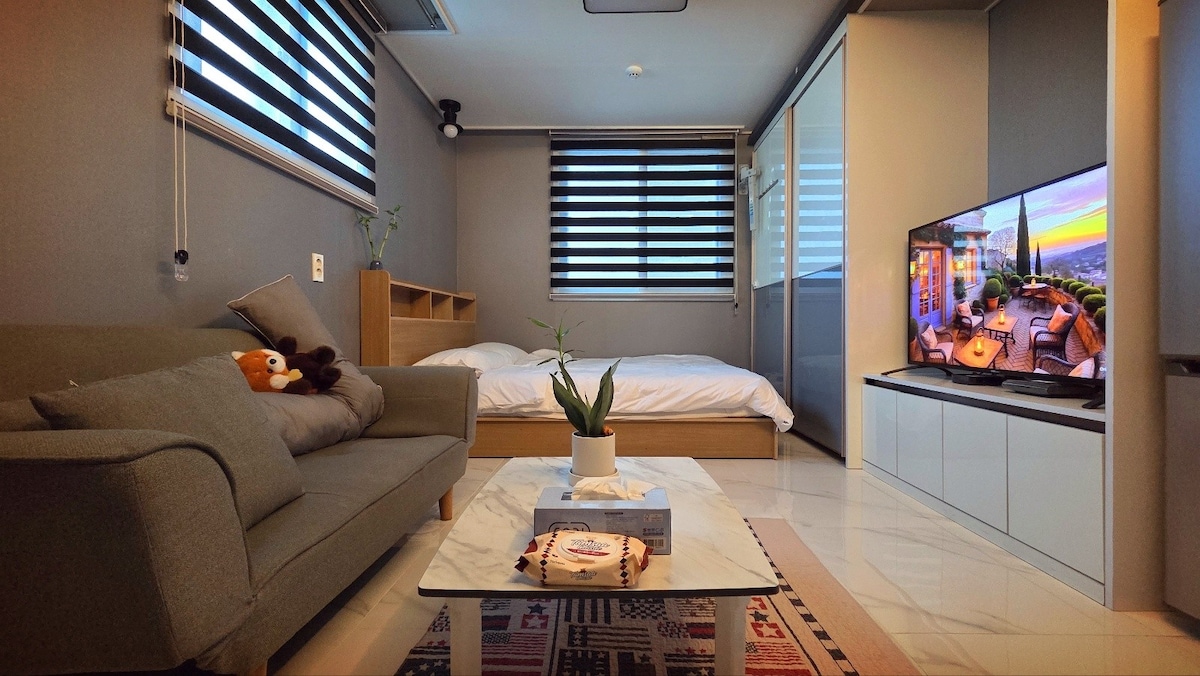 Willkommen im „The middle 9th studio“. Wir haben einen Raum vorbereitet, damit du dich wie zu Hause fühlen kannst. Für diejenigen, die für Langzeitaufenthalte, Geschäftsreisen und Reisen nach Daejeon kommen, haben wir sorgfältig die notwendigen Komfortwerkzeuge, Geräte und verschiedene tägliche Notwendigkeiten ausgestattet. ✔️ Viel Wohnfläche und ein gemütliches Schlafzimmer. ✔️ Saubere und praktische Küche, komplett ausgestattet mit grundlegendem Kochgeschirr. WLAN und Arbeitsbereich, um dich auf deine Arbeit zu ✔️ konzentrieren. (Esszimmer-Sofa) Praktische Haushaltsgeräte wie eine Waschmaschine, ein Trockner, ein Bügeleisen und ein Geschirrspüler ✔️ für Langzeitgäste. Es ist nicht nur ein Ort zum Schlafen, wir haben einen echten Wohnraum geschaffen. Wir haben es sorgfältig vorbereitet, damit du dich während einer Geschäftsreise oder eines längeren Aufenthalts nicht unwohl fühlst. Vielen Dank für deine Aufmerksamkeit und deine Nutzung. 🙏