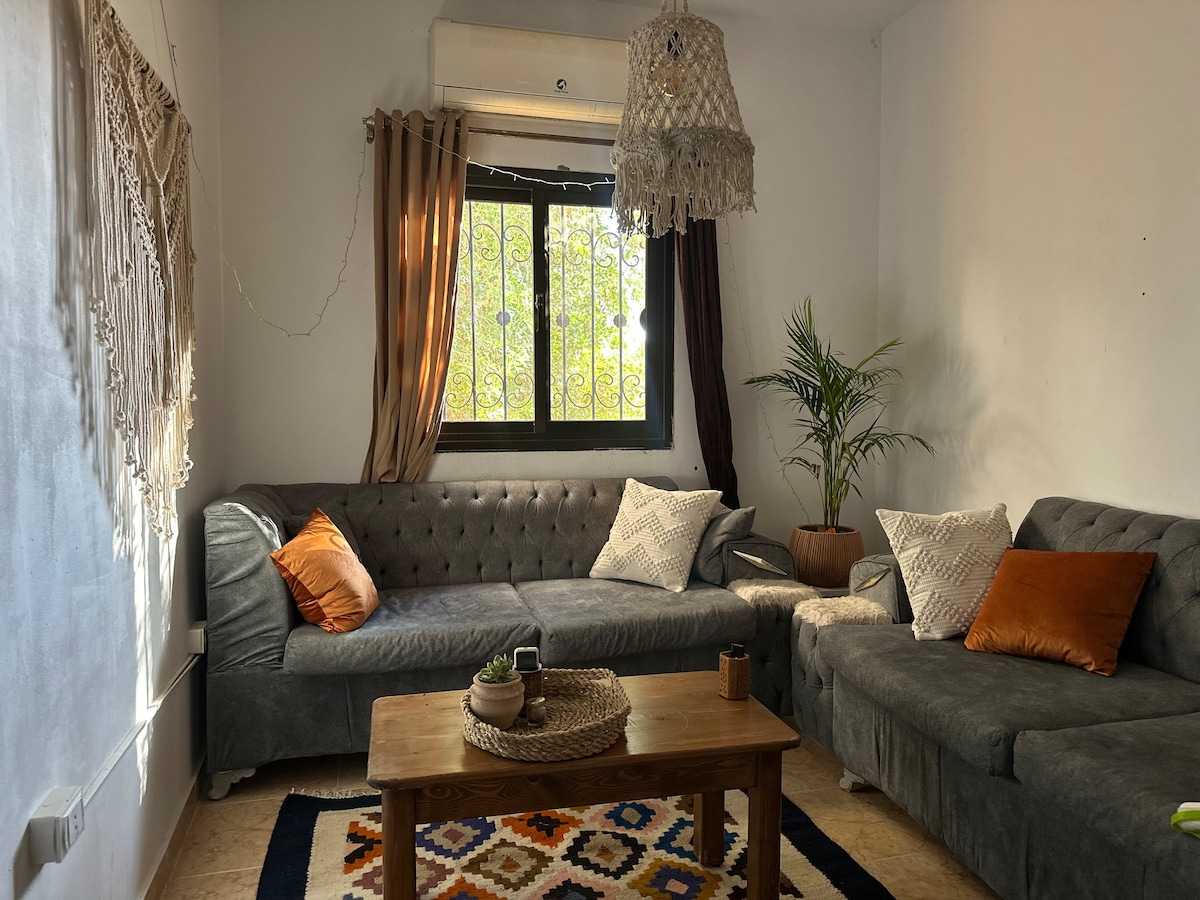 Eine sonnendurchflutete, neu renovierte 2-Zimmer-Wohnung mitten im Zentrum von Dahab. Das Haus ist in einem modernen/böhmischen Stil mit privatem Garten gestaltet. Dieses Haus ist strategisch günstig gelegen, nur 60 Gehminuten vom Strand und allen berühmten Restaurants und Tauchzentren von Dahab entfernt. Die Wohnung verfügt über einen privaten Eingang mit einem geräumigen Garten mit Blick auf die wunderschöne Landschaft der Berge und Palmen von Dahab. Nur weniger als eine Gehminute vom Strand und Dahabs berühmten Restaurants entfernt.