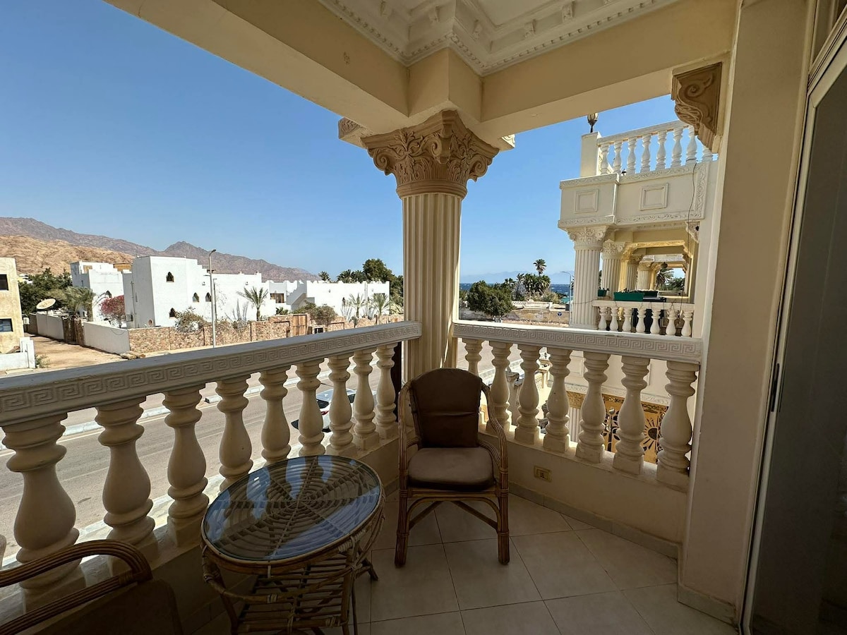 Willkommen in deinem gemütlichen zweiten Zuhause in Dahab! Die „Sea“-Through-Wohnung befindet sich im ersten Stock und bietet einen wunderschönen Blick auf das Meer durch Palmenzweige und Sonnenstrahlen, genau wie das Bild zeigt. Diese geräumige 1-Zimmer-Wohnung ist mit handgefertigten Möbeln und Accessoires gefüllt, die den organischen und natürlichen Lebensstil widerspiegeln, den wir in Dahab lieben. Das Hotel liegt in der zweiten Reihe direkt am Strand, nur 3 Gehminuten vom Assala-Markt und 10 Gehminuten vom Leuchtturm entfernt.