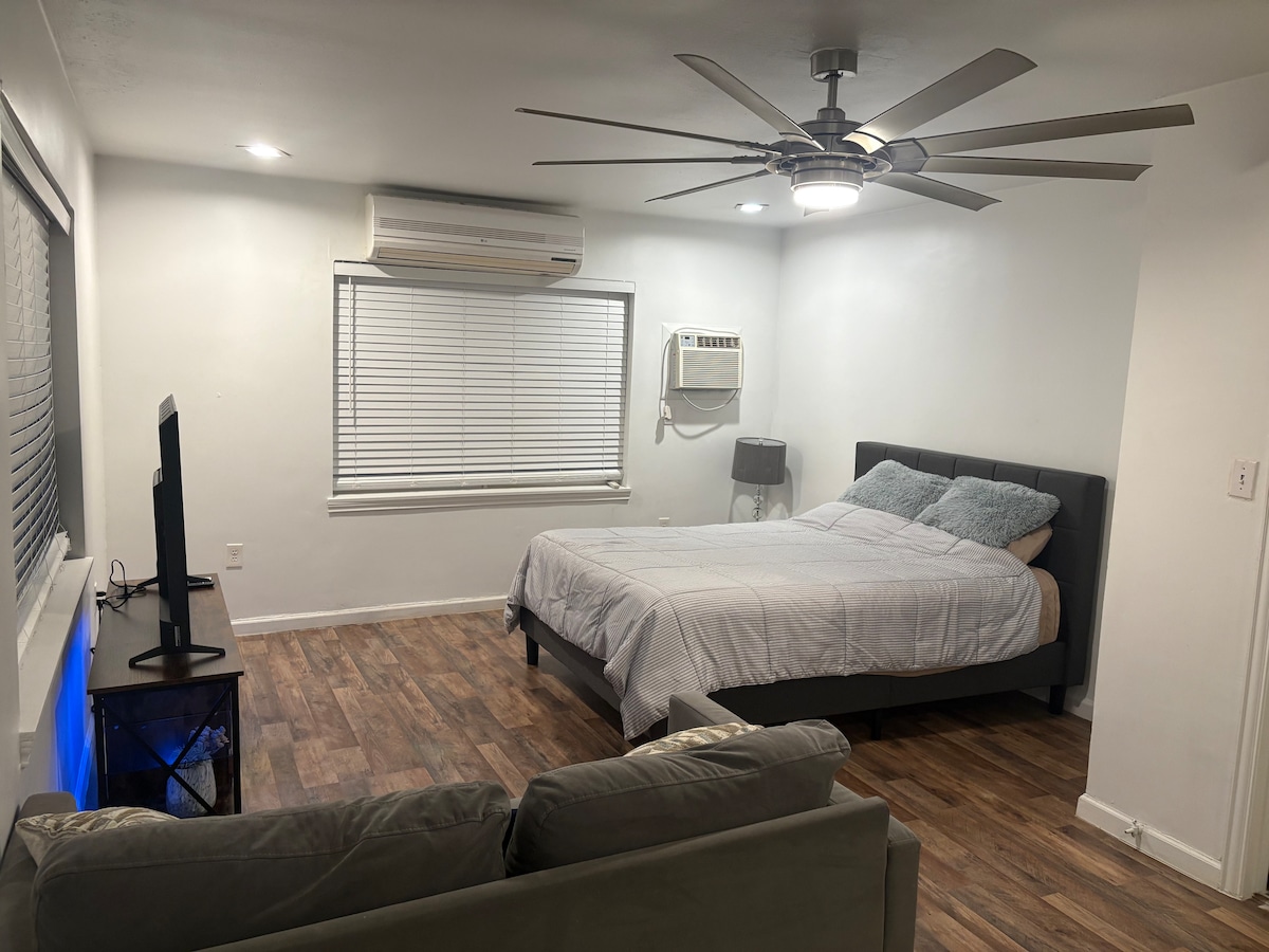Lehne dich zurück und entspanne dich – in dieser ruhigen, stilvollen Unterkunft, Privatzimmer mit eigenem Bad und Küche, privatem Eingang mit Smart-Schloss. Dies ist eine Garage, die in ein Zimmer umgewandelt wurde. Es ist ähnlich wie in einem Hotelzimmer, in dem der Raum maximal genutzt wird. Es ist für zwei Personen ausgelegt und ein gemütlicher und praktischer Ort. Sie besteht aus einer Terrasse am Eingang, auf der man rauchen oder sich entspannen kann, wenn das Wetter es zulässt. Sie verfügt über ein Queensize-Bett, Platz zum Arbeiten, einen 50-Zoll-Fernseher, eine Mikrowelle, einen Kühlschrank und einen Haartrockner.