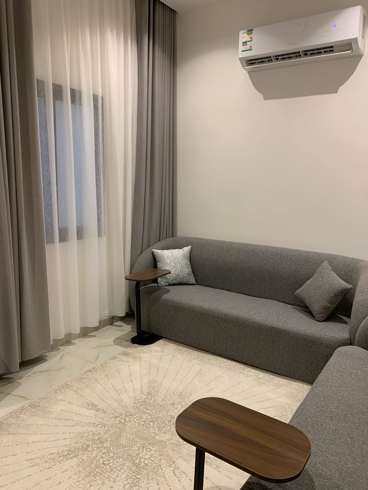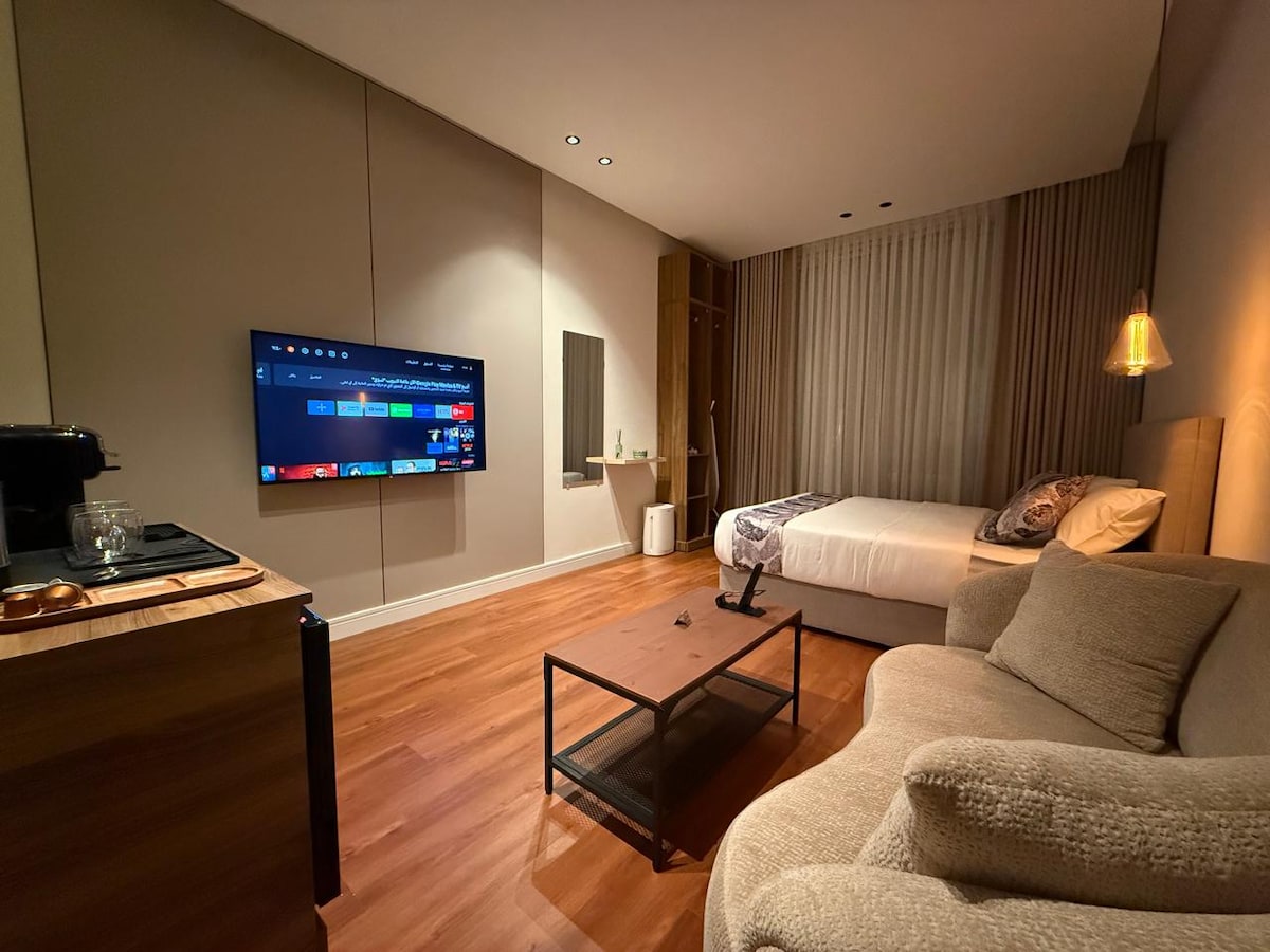 Ein Wohnstudio mit einem hohen Maß an Design und Verarbeitung, das modernen Komfort und ruhigen Luxus in einem integrierten Raum kombiniert, der einen unverwechselbaren Lebensstil bietet. Das Zimmer ist in einem offenen Stil gestaltet und bietet ein Gefühl von Geräumigkeit mit einer intelligenten Raumverteilung, die zu einem modernen Lebensstil passt.