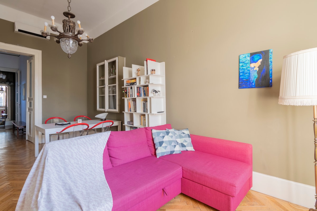 Erlebe, wie man in einem echten 150 Jahre alten Denkmal mit schönen hohen Decken (über 4,4 Meter), authentischen Details im Herzen der Innenstadt lebt. Das Haus war ursprünglich ein Palast und Bankhaus, entworfen von einem der bekanntesten Architekten Ungarns (Hild Jozsef) im klassizistischen Stil. Vom Frühling bis zum Herbst kannst du Budapest von einer der größten Terrassen in der Gegend mit Blumen und einigen Getränken genießen. Die Gegend ist zentral, aber nachts ruhig und friedlich.