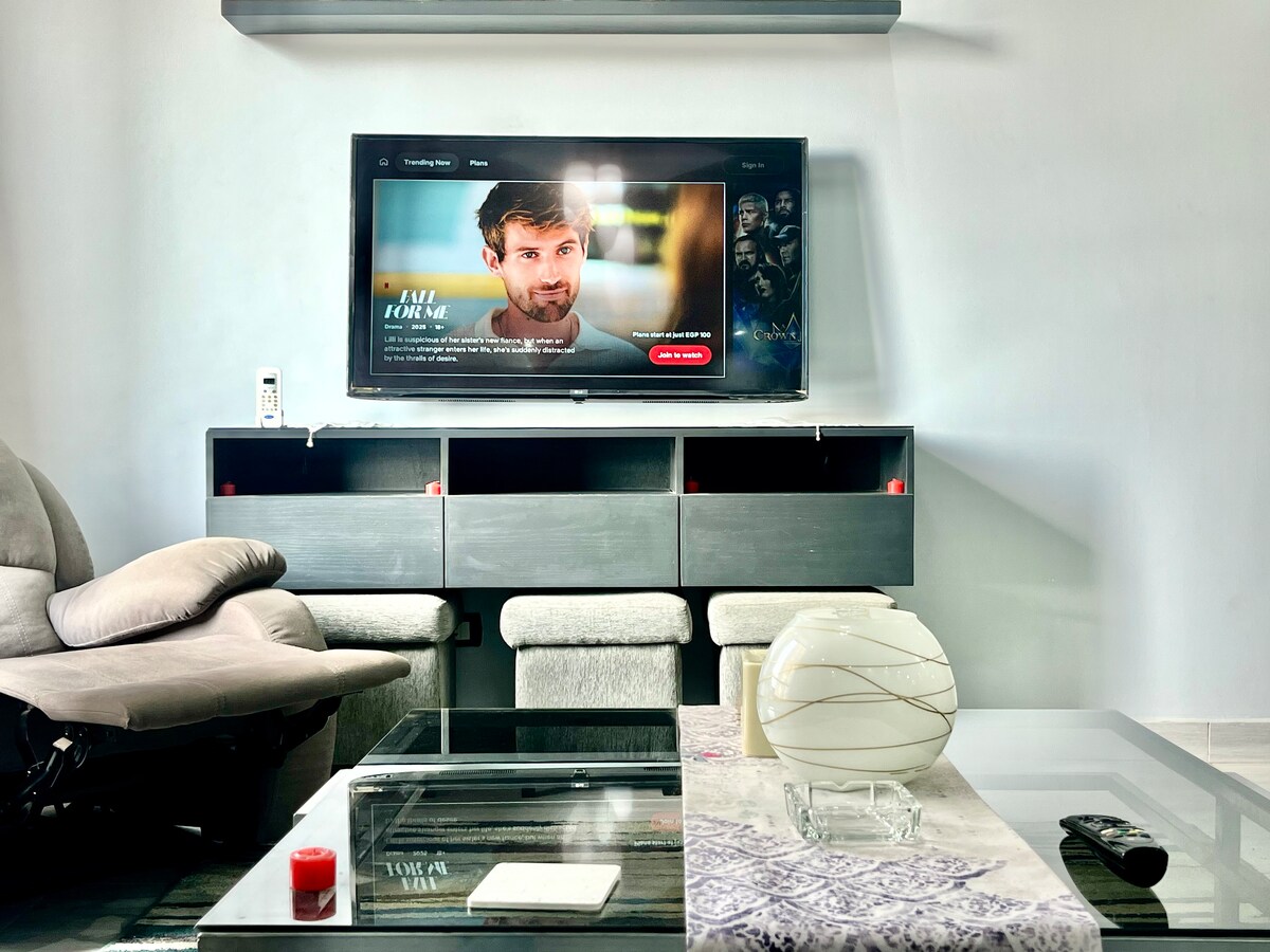 Wache in dieser modernen 2-Zimmer-Wohnung im Herzen von Maadi City mit atemberaubendem Blick auf den Nil auf. Das Haus ist perfekt für Familien, Freunde oder Geschäftsreisende und verfügt über ein helles Wohnzimmer mit Smart-TV, ein Schlafzimmer mit Kingsize-Bett, ein Schlafzimmer mit zwei Einzelbetten, einen Essbereich für sechs Personen und eine voll ausgestattete Küche. Genieße eine Klimaanlage in jedem Zimmer, eine Waschmaschine für längere Aufenthalte und ein sicheres Gebäude mit einer einladenden Lobby — alles in Gehweite von Cafés, Geschäften und Verkehrsmitteln.