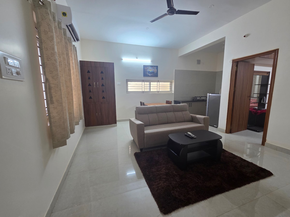 Entspanne dich mit deiner Familie an diesem ruhigen Ort. 3 Erwachsene und Kinder passen problemlos in diesen Bereich. Vor der Eingangstür befindet sich eine offene Terrasse auf diesem 1BHK-Haus. Die Entfernung vom Bahnhof Shimoga beträgt 4,3 km. 11-minütige Fahrt in einem Auto. Es sind Kochutensilien verfügbar. 1 Queensize-Bett mit Premium-Matratze und Einzelbett + Zustellbett stehen für zusätzliche Gäste zur Verfügung. Notstromversorgung (USV) installiert. Derzeit sind keine Aufzüge installiert, und das Gebäude befindet sich im dritten Stock.