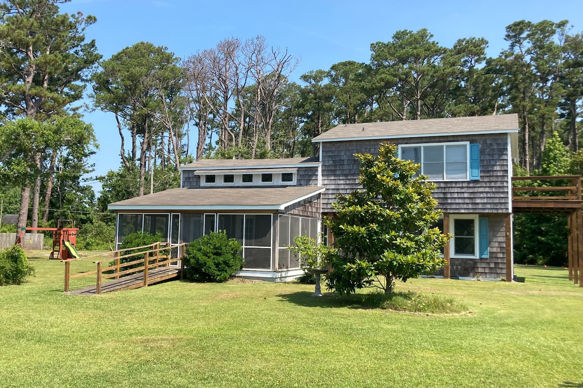 Entspanne dich mit der ganzen Familie auf der wunderschönen Harkers' Island. Lass deinen Alltag hinter dir, während du deinen morgendlichen Kaffee schlürfst und den Blick auf das Wasser und das Zwitschern der Vögel von der abgeschirmten Veranda aus genießt. Dieses Haus mit 3 Schlafzimmern und 2 Bädern wird sich wie dein ganz eigenes Refugium am Meer anfühlen. Dieses Haus ist wunderschön mit einem nautischen Thema und großen Panoramafenstern eingerichtet. Zu den Aktivitäten in der Nähe gehören das berühmte Angeln der Insel, Kajakfahren und die Fähre nach Shackleford Banks und Cape Lookout.