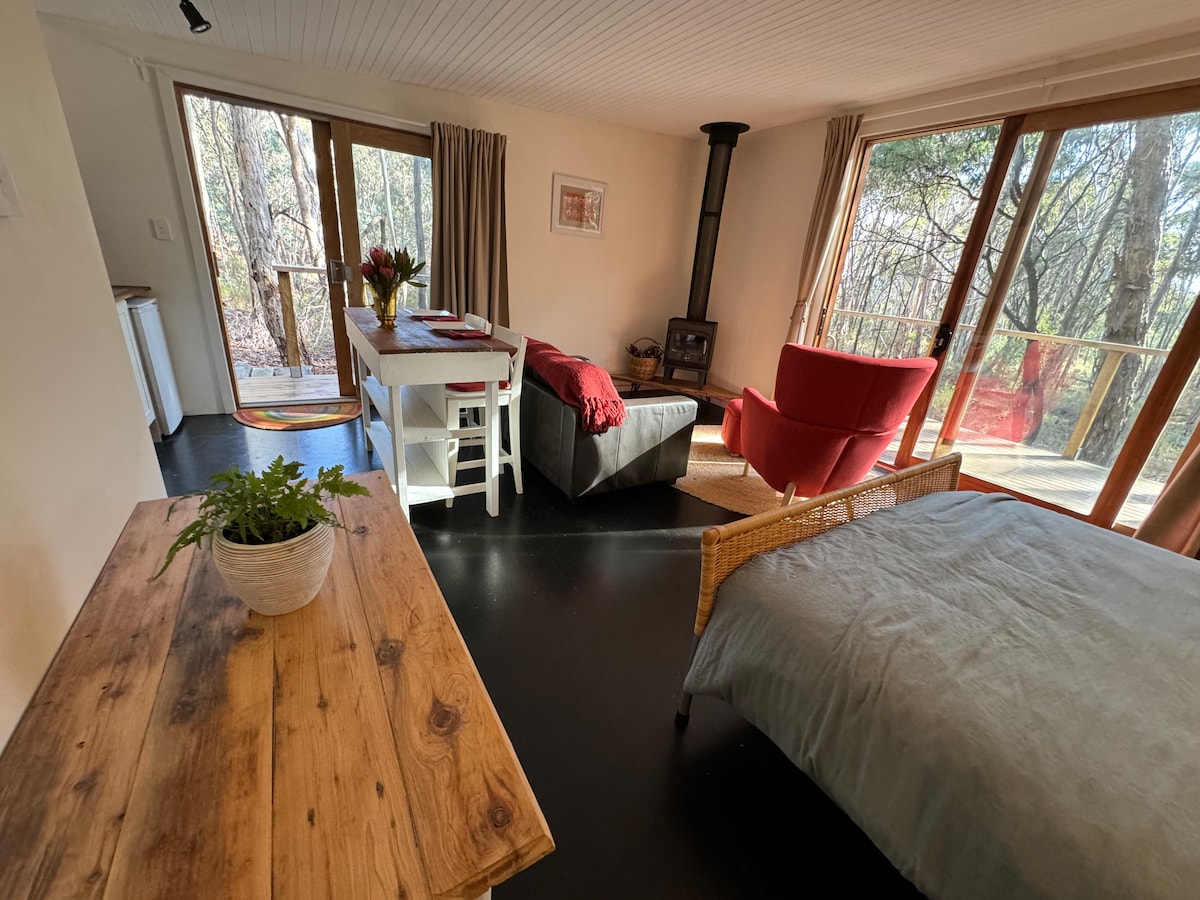 Das Hepburn Treehouse ist eine Oase im Herzen des malerischen Hepburn Springs. Diese maßgeschneiderte Unterkunft für zwei Personen liegt versteckt zwischen den Bäumen in einer markanten A-Rahmen-Studio-Hütte mit einem von der Mitte des Jahrhunderts inspirierten Stil. Sorgfältig und liebevoll kuratiert und mit persönlichen Möbeln, Objekten und Büchern aus der ganzen Welt gefüllt. Bodentiefe Fenster, luxuriöse Bettwäsche, Holzfeuer, hohe Decken und ein Spa-Bad sorgen für einen unvergesslichen Aufenthalt in diesem ruhigen Baumhaus.