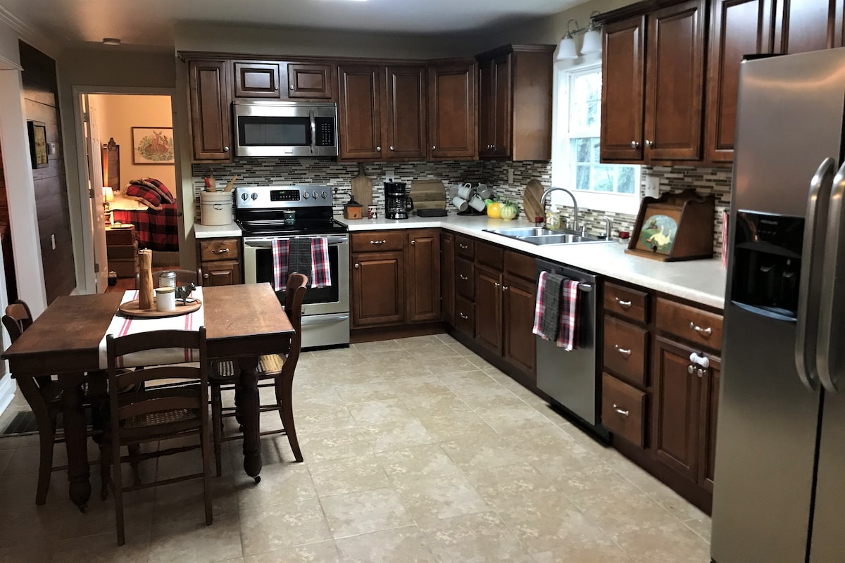 Romantische Hütte; perfekter, einzigartiger Landurlaub. 1440sf offener Grundriss mit Kingsize-Bett im Hauptbereich, WLAN, 75-Zoll-Smart-TV (kein Kabel, verwende deine TV-Apps), elektrische Kamine, Küche (kein Geschirrspüler), Waschmaschine und Trockner in voller Größe, Essbereich, begehbarer Kleiderschrank, ein Bad mit Dusche und Badewanne. Angrenzendes Zimmer, das durch Vorhänge und Möbel getrennt ist, nicht durch Wände/Türen. Enthält ein Doppeltagesbett mit ausziehbarem Auszug, das es zu einem Kingsize-Bett macht. Das Anwesen liegt auf 20 eingezäunten Acres mit sicherem Tor, Feuerstelle und Angelteich, der dich nicht enttäuschen wird!