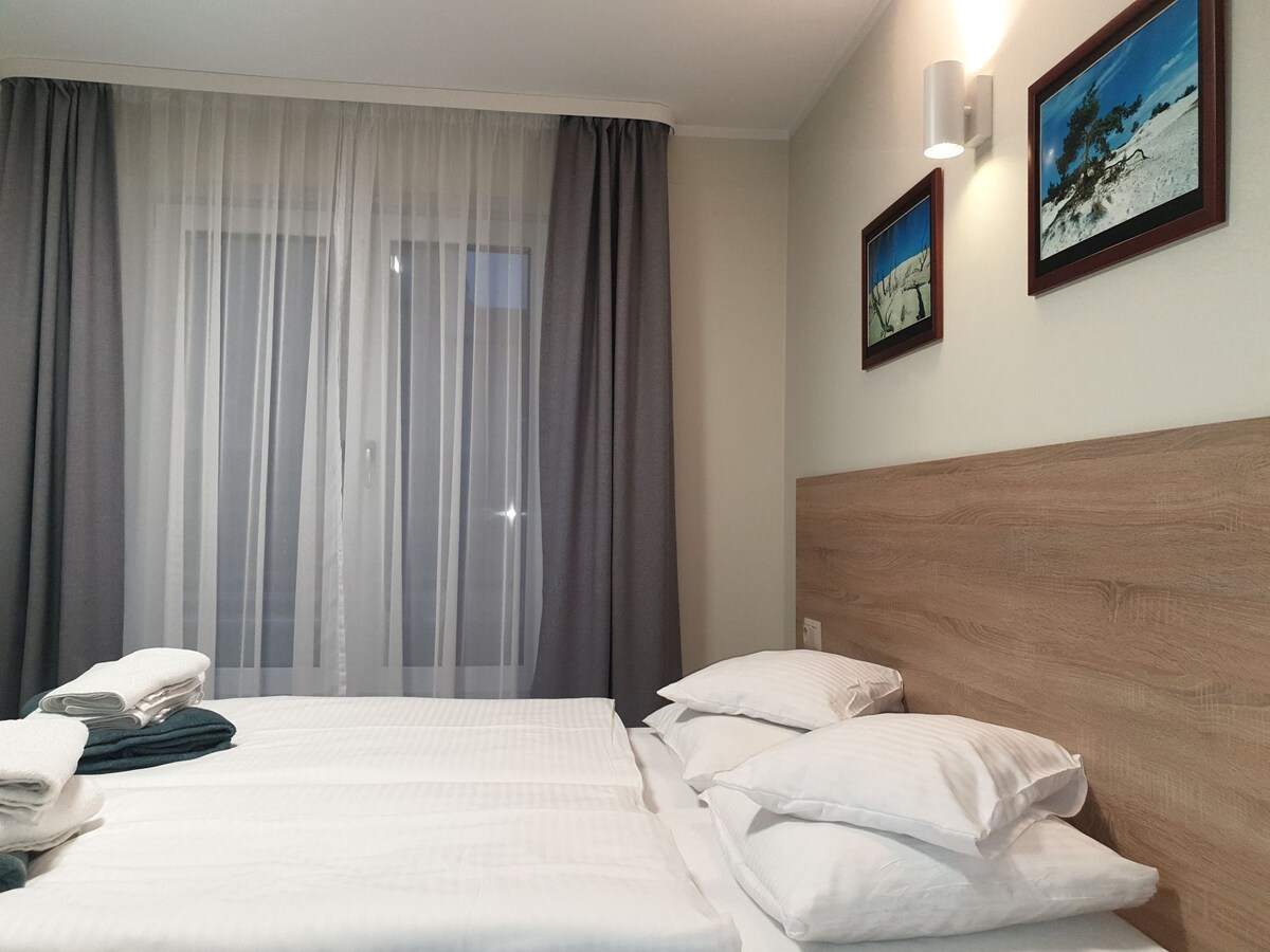 Przestronny apartament 70 m² z tarasem znajduje się w centrum Łeby, jednak położony w cichej okolicy. W apartamencie znajdują się dwie sypialnie, jedna z łóżkiem małżeńskim i druga z dwoma łóżkami, łazienka z prysznicem oraz salon z kanapą z funkcją spania. Kuchnia jest przestronna i w pełni wyposażona. Na terenie obiektu znajduje się plac zabaw dla dzieci oraz zielony ogród.