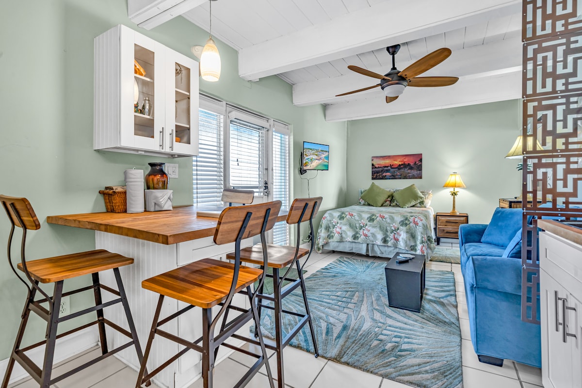 Schöne renovierte Studio-Eigentumswohnung am Key Colony Beach mit eigenem Balkon, beheiztem Pool und Sandstrand. Continental Inn Unit #35 bietet ein Kingsize-Bett und eine voll ausgestattete Küche mit Grundausstattung (Herd, Backofen, Toaster, Mikrowelle, Mixer, Kühlschrank, Kochutensilien). Zuverlässiges WLAN und ein Fernseher. Genieße einen kurzen Spaziergang zum Sunset Park nebenan, um einen atemberaubenden Sonnenuntergang in Florida Keys zu erleben. Gäste haben auch Zugang zu einem Privatstrand mit Liegestühlen, Terrassentischen, Tiki-Hütten und Grills.